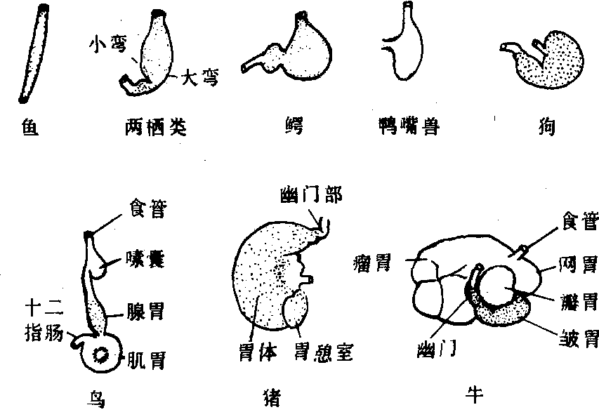 释义 | 胃Wèi现行较罕见姓氏。今湖北之老河口,山西之长治、运城、忻州、临汾等地有分布。《新编千家姓》亦收载; 《中文大字典》 引 《广东通志》载: “胃宗海,阳县人,成化七年乡举。”知明成化年间即有胃姓,唯未详其源。 胃wèi人和脊椎動物消化管的擴大部分,是貯藏和消化食物的器官。王延壽《王孫賦》:“儲糧食於兩頰,稍委輸於胃脾。” 胃读音·ui(ˋ),为ui韵目,属i—ei—ui韵部。于贵切,去,未韵。 上一条: 𧕈 下一条: 㥜 胃〔wei〕ghob qib. ![]() ![]() 胃wèi人和某些动物消化器官的一部分,上连食道,下连十二指肠。 胃❶人和高等动物消化器官的一部分,形状像口袋。能分泌胃液,消化食物:~液︱~脘(wan)︱~酸︱~腺︱~口︱~病︱~炎︱健~︱开~︱翻~︱反~︱败~︱脾~︱肠~。 胃wèi人或动物消化器官的一部分,上端与食道相连,下端与肠相连:肠胃│胃病│胃液。 胃wei胃癌 胃病 胃肠 胃火 胃镜 胃口 胃气 胃酸 胃缩胃腺 胃炎 胃液 胃蝇 败胃 翻胃 反胃 开胃 瘤胃 脾胃 皱胃 胃肠炎 胃窦炎 胃溃疡 蜂巢胃 胃wèi主管消化食物的器官:依我说,先以平肝健~为要。(四五·1040) 古代名物 > 人體類 > 軀幹部 > 腹 > 胃 胃 wèi 亦稱“太倉”、“廚府”。六腑之一。即胃臟。可受納腐熟飲食,並下注於腸。其稱始見於先秦典籍,今沿稱。《靈樞經·五味》:“胃者,五藏六府之海也,水穀皆入於胃,五藏六府皆禀氣於胃。”《黄庭内景經》:“脾長一尺,掩太倉。”注:“太倉,胃也。”《雲笈七籤》卷二十引《神仙經》曰:“胃爲倉,三皇五帝之廚府也,房心爲天子之宫,諸神皆就太倉中飲食,故胃爲太倉。” 古代名物 > 天象類 > 天體部 > 二十八宿 > 胃宿 > 胃 胃 wèi 即胃宿。 胃【同义】总目录 胃太仓 胃wèi❶ 人和动物消化器官的一部分。《韩非子·喻老》:“居十日,扁鹊复见,曰:‘君之病在肠~,不治将益深。’” 胃*weiCEB8 消化器官 消化器官胃:胃(~酸;~液;健~;开~) 食肠水谷之海 仓廪之官 ☚ 呼吸器官 泌尿器官 ☛ 常见星 常见星牵牛织女星:灵匹 双星 牛女 女牛 ☚ 各种星 银河 ☛ 胃stomach六腑之一。主受纳和腐熟水谷。《司牧安骥集》“马师皇五脏论”:“胃者,草谷之腑。”胃的功能即胃气,胃气宜和宜降。胃气和降才能受纳和腐熟水谷,并将胃内容物推送入小肠。胃与脾相表里,共同完成水谷的消化、吸收, 故脾胃合称为 “后天之本”。若胃气和降失常,常会引起食欲不振、胃脘疼痛、嗳气或翻胃呕吐等症。临证中对疾病的诊疗和推断预后, 都须十分重视胃气的盛衰,故有“纳谷者昌, 绝谷者亡”, “有胃气则生, 无胃气则死”之说。 胃stomach介于食管与小肠之间的消化管膨大部。可暂时贮藏食物、分泌胃液、拌和食物进行初步消化,并产生一些激素,促进胃肠的分泌和活动。 脊椎动物胃的形态和类型 哺乳动物的胃 按外形可分为单室胃和多室胃。❶单室胃,为大多数哺乳动物的胃。一般呈“丁”或“U”形囊,略向上弯曲。上缘短、凹,称胃小弯,下缘长、凸,称胃大弯。胃的入口称贲门,与食管相接。胃的左部膨大叫胃底,猪胃左端背侧还有一扁平的锥状盲囊,称胃憩室; 中部叫胃体; 右部较缩细叫幽门部。胃的出口叫幽门,接十二指肠,此处表面有环状缩细部,为幽门括约肌所在,单室胃依粘膜的特点又分为: ❶单室无腺胃或食管型胃,胃粘膜与食管粘膜相似,色白,衬以复层扁平上皮,缺腺体,见于鸭嘴兽、针鼹; ❷单室腺胃或肠型胃,胃粘膜柔软,衬以单层柱状上皮,具有胃腺,见于猫、狗、兔和人类等; ❸单室混合型胃,胃粘膜分为两部分,贲门附近为食管型上皮,其余部分为肠型上皮,见于鼠类、猪和马等。猪的无腺区不大,马的很大,几乎占胃粘膜的1/3。 ❹多室胃由二个或二个以上的室组成。食草啮齿类绢鼠为二室胃,第一室称前胃,无腺体,第二室相当于单室腺胃。海豚为三室胃,前胃无腺体,第二室为主胃,相当于胃底腺部,第三室为幽门胃,相当于幽门腺部,并以连接管与第二室相连;白暨豚亦是多室胃,其前胃并非无腺部,而是扩大的腺胃,后接三个较小的室。偶蹄反刍类如牛、羊、鹿的胃分四室:瘤胃、网胃、瓣胃和皱胃;前三胃合称前胃,无腺体; 皱胃是真正的腺胃。瘤胃分为背、腹两个大囊,每囊的后端均以盲囊终止。网胃位于瘤胃背囊的前端,呈稍扁的长椭圆形。瓣胃呈球形(牛)或卵圆形(羊),位于瘤网胃右侧。皱胃呈梨形,位于瘤胃腹囊的右侧,瓣胃的腹侧,幽门部斜向上弯曲。成年动物四胃的容量比例如下: 瘤胃牛占80%,羊占79.1%; 网胃牛占5%,羊占6.8%; 瓣胃牛占7%,羊占3%;皱胃牛占8%,羊占11.1%。 瘤胃内面被肉柱围成瘤胃内口,沟通背囊与腹囊。瘤胃的入口为贲门; 从贲门处起有网胃沟 (又称食管沟)沿瘤胃和网胃右壁略呈螺旋状延伸到网瓣胃口。在哺乳期当幼畜吮乳时,沟的两唇可闭合成管状,将乳汁直接导入皱胃。 禽胃 由腺胃和肌胃两部分构成。❶腺胃粘膜大部分呈微红色,衬以含粘蛋白颗粒的单层柱状上皮,粘膜表面有许多凸出的圆形乳头。胃腺有单管腺和复管腺两种: 浅层为单管腺,由上皮凹陷于固有层而成,衬以单层立方或柱状上皮: 导管短,开口于粘膜褶之间的沟内,主要分泌粘液;深层为复管腺,位于固有层内,体积大,在切面上肉眼可见。深腺细胞仅由一种类型细胞构成,具有哺乳动物胃腺壁细胞和胃酶细胞(主细胞)的特征,称泌酸胃酶细胞; 兼有产生盐酸和胃蛋白酶的作用。腺小管
