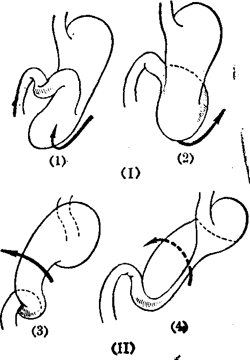 分类, ❶按扭转程度分完全扭转和部分扭转。后者多属幽门区扭转。 ❷按扭转方向,分向前扭转和向后扭转。 ❸按病因,分原发性和继发性扭转,后者继发于胃或附近器官疾病,如食管裂孔疝。 ❹按扭转发生经过,分急性与慢性扭转,后者症状有持续性或间隙性,有时无症状。 临床表现,病儿睡卧不安,经常呃逆。上腹部膨隆有局限性压痛,腹肌紧张,隆起处呈鼓音,阵发性疼痛向背部放射。有急性胃扩张表现者,放入鼻胃管可抽出大量腥臭胃内容物。下腹平坦、柔软。胃近端梗阻则有剧烈恶心。开始呕吐频繁,吐出无胆汁的胃内容物;以后反复干呕、无呕吐物。放置胃管有困难或很难放入。 慢性胃扭转的症状不典型,上腹部饱满、进食后有疼痛及呕吐,剧烈疼痛呈一过性,症状类似溃疡病或胃炎; 有时突然演变成急性梗阻。 钡餐检查,器官轴型扭转显示胃粘膜走行纡曲,胃大弯位于胃小弯之上,胃外形呈大虾状,胃腔有两个液平面,幽门向下,幽门窦位置于十二指肠球部上方,食管腹段延长,开口于胃下方。系膜轴型扭转时,粘膜呈十字交叉,膈肌下有重复气泡及液平面,幽门位置抬高,接近贲门平面,横膈左侧抬高。直立位透视胃呈“颠倒”状,远端有梗阻。 慢性扭转应给小量、少胀气的食物,内服促进蠕动的药物,对婴儿可取头高斜坡位,面向右侧,勿使大量空气进入胃内,进奶后保持原来体位半小时。按此法数月后胃扭转可自行复位。 上腹膨隆,反复干呕和不能置入胃管者,提示有急性胃扭转,应手术解除病因。有膈疝,膈膨升者行膈肌修补术;扩大的食管裂孔除修补外,并行胃底摺叠术,术中未发现横膈或韧带异常时,为防止再扭转可行胃固定术,将靠近贲门的胃小弯附近的胃前壁固定于腹前壁。 ☚ 急性胃扩张 胃粘膜脱垂 ☛ |