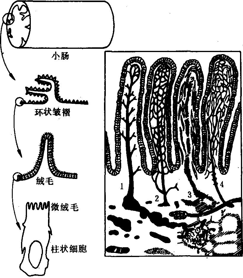 释义 | 胃肠吸收gastro-intestinal absorption营养分在胃肠道内通过胃肠上皮进入血液、淋巴或粘膜下组织间隙的过程。 小肠粘膜皱褶及绒毛结构模式图