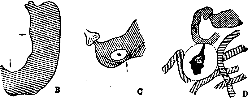 胃平滑肌瘤 可发生在胃的各部(图BC)。发生在胃底贲门者,用双重造影法显示最清楚。肿瘤显示为一类圆形或半圆形突向腔内的软组织块影,边缘大多整齐锐利。这种块影本身颇难与癌瘤和平滑肌肉瘤区别。食管不受侵犯有助于本病与癌瘤的鉴别。胃体和胃窦前后壁的平滑肌瘤表现为光滑锐利的充盈缺损,钡剂充满时被遮住不见,加压检查始能显示。其上粘膜展平,不见皱襞。平滑肌瘤表面易成溃疡,加压时可见充盈缺损中出现龛影。大弯或小弯的平滑肌瘤在胃壁上造成弧状充盈缺损,类似外压性改变。充盈缺损的中央常见龛影,呈锥形突出。胃平滑肌肉瘤体积较大,发展较快,钡餐检查所见的充盈缺损常较大,轮廓不规则并呈分叶状,其中龛影常较大而深,并不规则。可摸到肿块。