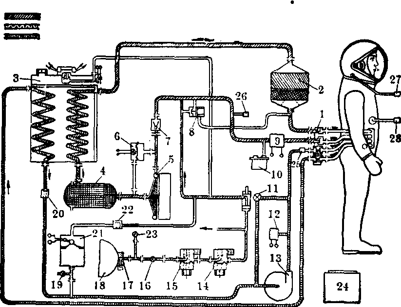 1.管道接头 2.净化罐 3.蒸发式热交换器 4.去湿器 5.风机 6.开动风机的传感器 7.反向阀门 8.泄漏氧气补偿器 9.二氧化碳分析器 10.氧分压传感器 11.活门 12.水压传感器 13.水泵 14,15.减压器 16.活门 17.氧气接嘴 18.氧气瓶 19.水阀门 20.反向阀门 21.水箱 22.反向阀门 23.压力计 24.蓄电池 25.水温传感器 26.温度传感器 27.无线电通讯接头 28.遥测接头