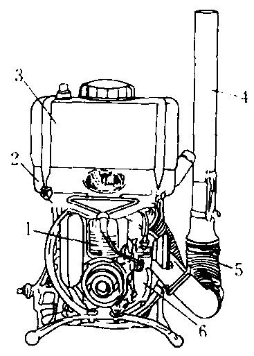 背负式机动喷雾机 1.发动机 2.油箱 3. 药箱4. 喷管 5. 软管 6. 风机 |