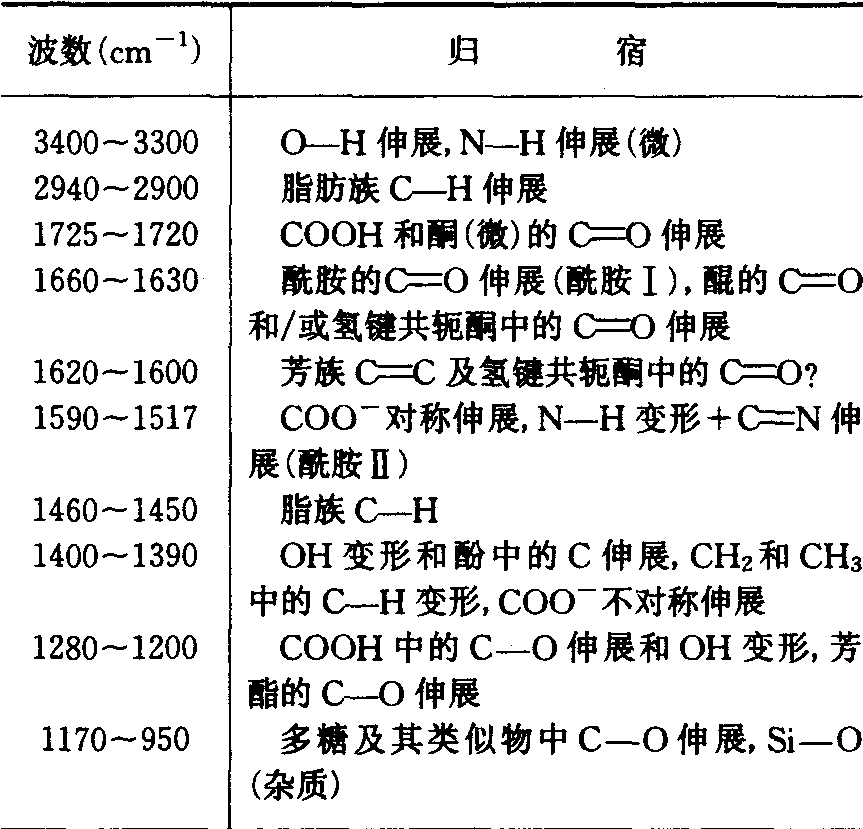 物理性质 光谱特征 胡敏酸在紫外和可见光波段,除在250~280毫微米区间常显现一肩峰外,光密度值总是随波长增大而减小,无特征吸收。250~280毫微米区间的肩峰据信是由单独的苯环所引起,其峰高与腐殖化度有关。水稻土胡敏酸的该峰高常较相应旱地土壤胡敏酸的为高。可见波段的消光系数据信主要是由较长的共轭双键所致。这类共轭双键的胡敏酸,其消光系数较大。不同土壤胡敏酸的消光系数差异很大,它们依以下序列递降:黑土、黑垆土>栗钙土>灰褐土、黄棕壤>红壤、黄壤。 胡敏酸在红外波段有许多吸收峰,表明它具有高度不饱和的结构,含有羧基、羟基和烷基。相当一部分羧基位于相邻的位置。此外,它可能还含有酰胺、酯、醌等(表3)。腐殖化度不同的胡敏酸,其主要吸收峰的强度略有所不同。腐殖化度低的,其2920/厘米处的吸收带很明显,同时1540/厘米处的吸收带也常明显。腐殖化度较高的则否,同时,E1720cm-1/E1600cm-1的比值常大于1。胡敏酸有明显的顺磁共振信号。不 表3 胡敏酸的主要红外吸收带 表4 土壤胡敏酸13C核磁共振谱中的主要信号