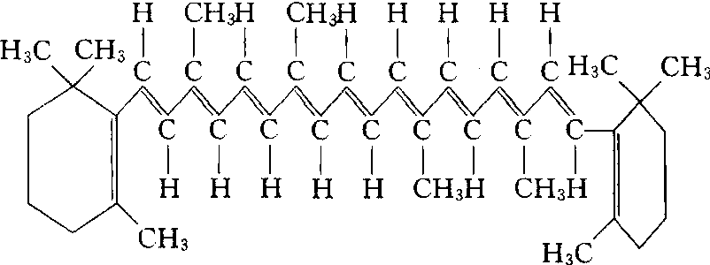 类胡萝卜素的一种。它是不饱和的碳氢化合物,分子式为C40H56。有α、β、γ三种异构体,在绿色植物中主要是β-胡萝卜素。胡萝卜素不溶于水,能溶于己烷、石油醚等有机溶剂中。它主要吸收蓝紫光,呈橙黄色。胡萝卜素和叶黄素存在于所有光合细胞的叶绿体中,它们能保护叶绿素免受光氧化而被破坏,另外它们吸收的光通过传递,可用于光合作用。胡萝卜素还含于胡萝卜根、南瓜果肉、柑桔果皮等中。胡萝卜素在动物和人体内可转化成维生素A。各种含胡萝卜素的水果(如杏、芒果、枇杷等)、蔬菜可作为动物和人类维生素A的来源。