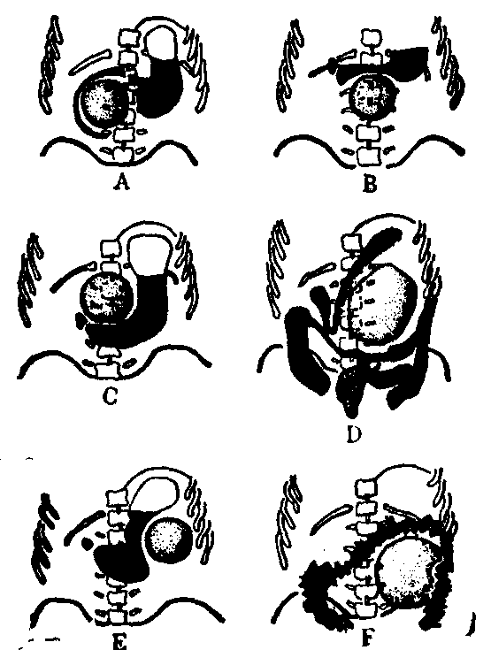 各型胰腺囊肿引起胃肠道压迫移位示意图 A. 胰腺头部囊肿 B. 胰腺颈部囊肿 C. 胃-肝型胰腺囊肿 D.胰腺体部囊肿 E.胰腺尾部囊肿 F.结肠系膜型胰腺囊肿 ☚ 胰腺炎 胰腺癌 ☛