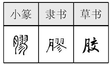 jiāo膠,形声,从月(肉),翏(liù)声,本义为有黏性、能粘合器物的物质,引申为用胶粘住、像胶一样有黏性的、橡胶等。《简化字表》简作“胶”,音符改为交。 【辨析】 “胶”又读xiáo,牲畜的后胫骨,与“膠”不是等义简繁字。 |
