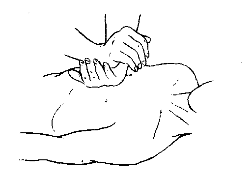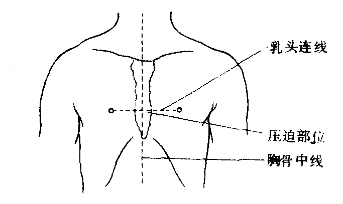 释义 | 胸外心脏按压法 胸外心脏按压法是用人工的方法,有节律地在胸腔外部间接地按压左右心室,使血液流入主动脉和肺动脉,建立有效的大小循环,来代替心脏的自主收缩,是对心跳骤停病人有效的现场抢救方法之一。操作方法病人必须仰卧在硬板床或地上,操作者双手交叉重叠,下面一手的掌跟部放在病人胸骨下1/3即胸骨中线与两乳连线的相交处(图2—2—21)。以拇指跟部为轴心手指翘起不接触病人胸壁,臂伸直,依靠操作者的体重、肘及臂力,有节律地垂直施加压力,使胸骨下陷3~4厘米,然后放松解除压力使胸骨复原(图2—2—22)。按压时将左心室中血液排出,解除压力后,血液进入左心室为一被动过程,需要一定时间,因此按压时间为1/3放松的时间为2/3。对小儿按压时可用一只手掌跟部加压,新生儿用2~3手指加压。按压的次数成人为每分钟80~100次,小儿酌情。按压时力量与深度要适当,不可用力过猛以免造成肋骨骨折。按压的有效指征是可以摸到大动脉的搏动,收缩压在60毫米汞柱以上,面色口唇由灰白转为粉红色,散大的瞳孔缩小和出现自主呼吸。心脏按压与人工呼吸同时进行时为每按压4~5次进行一次人工呼吸。