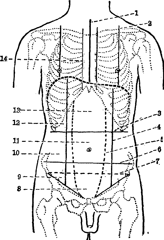 释义 | 胸腹壁的标志线与腹部分区 胸腹壁的标志线与腹部分区为确定体内器官的位置和体表投影,特在胸、腹壁规定若干标志线,用以分区(见图)。 胸部标志线与腹部分区 腹部 以两条横线和两条垂直线将腹部分为9个区:上横线为两侧肋弓最低点的连线,即肋下线;下横线是两侧髂嵴结节的连线,即结节间线,(或取两侧髂前上棘间的连线,即棘间线)。两条垂直线是通过两侧腹股沟韧带中点的垂线,它们分别与横线垂直相交。(有人主张采用沿腹直肌侧缘的垂线)。9个区由上而下为:中间的腹上区、脐区和耻区(腹下区);两侧的左及右季肋区、左右腹外侧区和左右腹股沟区。另有一种简便分区法,是画纵横各一条直线,在脐处成直角相交,将腹部划分为四个象限,即: 左、右上象限及左、右下象限。 ☚ 附肢的筋膜 内脏 ☛ |