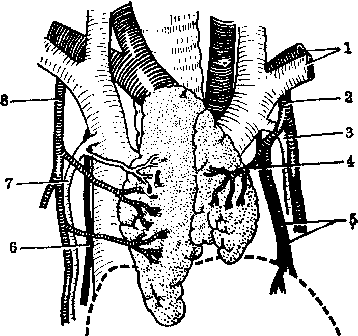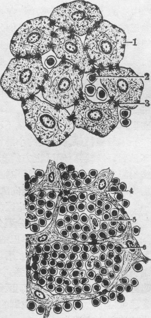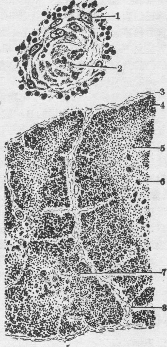 释义 | 器官1 器官1器(消化~;生殖~) 官(~能;五~;感~) 另见:功能 体内各部 ☚ 体内各部分 循环器官 ☛ 胸腺thymus起源于咽囊,并以培育T-淋巴细胞为主要功能的初级淋巴器官。哺乳动物的胸腺分左右两叶,位于胸纵隔前腔,有的种类可延伸至颈部。胸腺在性成熟时体积最大,此后停止生长并逐渐退化至老年几完全被脂肪组织替代; 营养不良、疾病和某些药物可导致胸腺暂时性萎缩。 胸腺thymus动物哺育T淋巴细胞成熟的中枢淋巴器官。在哺乳动物需分两叶,位于颈胸部。有明显的年龄变化,动物在新生时已充分发育,以后随着年龄增长而逐渐退化。外包薄层结缔组织被膜,结缔组织内伸将实质分布成许多分隔不完全的小叶。小叶可分为皮质和髓质,由以上皮样网状细胞为支架的淋巴组织构成,大量淋巴细胞和一些巨噬细胞分布于网眼中。上皮样网状细胞能分泌多种胸腺激素,有诱导干细胞分化成为成熟T淋巴细胞的作用。皮质中有大、中、小T淋巴细胞,从皮质浅层向深层不断分裂分化成熟,细胞体积随之逐渐变小。成熟的小淋巴细胞经血管转移到周围淋巴器官中,但多数淋巴细胞在成熟过程中被巨噬细胞所吞噬。髓质含淋巴细胞较少,存在胸腺小体,功能不详。在较低等的脊椎动物,胸腺中除T淋巴细胞外还可存在大量B淋巴细胞。 胸腺 胸腺xiongxian淋巴器官之一,兼有内分泌功能。胸腺位于胸骨后、气管前,是灰红色、柔软的腺体,分左右两叶,呈不对称的扁锥体形。整个腺体由上皮网状细胞为支架,其中充满淋巴细胞。上皮网状细胞分泌胸腺素。淋巴细胞是骨髓中的造血干细胞随血液进入胸腺后形成的,在胸腺素作用下,成为有免疫活性的T淋巴细胞,参与细胞免疫。如果在刚出生时便摘除胸腺,免疫功能便会明显低下。胸腺随年龄而改变大小,出生时10~15克,青春期可达30~40克,20岁以后逐渐退化,被脂肪组织所取代,45岁~50岁后萎缩至10~15克,且主要为脂肪。胸腺还是一个对饥饿、中毒、严重创伤等不利因素十分敏感的器官,遇上述情况时,一二天内便可缩小一半以上。 ☚ 甲状旁腺 胸腺素 ☛ 胸腺 胸腺xiongxian一种淋巴组织器官。位于胸腔内,紧靠心脏和大血管的起始部,呈灰红色,分为大小不等、略似锥形的左右两叶(见图)。胸腺在出生后两年内生长很快,以后随年龄而继续增长,青春期达到最大体积,此时重量可达35克,青春期以后逐渐萎缩退化,成年后被脂肪组织所代替。胸腺在功能旺盛期间,分泌胸腺素,可赋予淋巴细胞免疫活力。可见,胸腺功能的好坏,直接关系到人体抵抗力的强弱。如果胸腺发育不良或过度生长,都会使人生病。近年来的研究表明,胸腺除有赋予淋巴细胞免疫活力的功能外,还与人的衰老有关。 胸腺 ☚ 脾脏 排泄 ☛ 胸腺thymus gland系一重要的造血和免疫器官。位于胸骨和肋软骨的后方,心底大血管和主动脉弓的前面。可分左、右2叶,均似锥形。新生儿胸腺约重10~15g,在青春期可达30~40g,以后逐渐萎缩,由脂肪组织代替。胸腺具有造血和免疫的功能。 胸腺位于胸腔内的淋巴器官。兼有内分泌功能。由左右两叶组成,质柔软,有明显的年龄变化。新生儿期体积最大,至青春期后逐渐退化,成人胸腺组织多被脂肪组织代替。主要功能是产生T淋巴细胞及分泌胸腺激素。 胸腺 胸腺胸腺是个淋巴器官,兼有内分泌功能,故列入内分泌腺,也有人把它归入淋巴器官。胸腺位于胸腔上纵隔的前部,由形态不一的左右两叶组成,有时此粗彼细或彼长此短。两叶常前后叠掩,并由结缔组织紧紧相连,故有时可误作为是单个器官。胸腺的上端达胸腔上口,或可伸入颈根部,下端至心包的上部;前面稍凸,大部分被肺和胸膜遮掩;后面凹陷,直接贴附于心包和大血管的前面。胸腺的年龄变化明显,新生儿和幼儿的胸腺相对较大,灰红色,质柔软,重约10~15g。性成熟期的胸腺,最大重量为25~45g,性成熟期以后,开始萎缩逐渐变小,至老年胸腺重量仅为10~15g,其实质多由脂肪组织所代替变为浅黄色。胸腺表面有结缔组织被膜,其纤维伸入腺的实质,把胸腺分成若干不完全分隔的小叶,小叶周围部为皮质,深部为髓质。皮质主要由淋巴细胞和上皮性网状细胞构成,髓质的细胞多数为上皮性网状细胞和少量淋巴细胞。在髓质可见大小不等的圆形或卵圆形的胸腺小体(Hassall小体),由数层网状上皮细胞排列而成。胸腺内的淋巴细胞称为胸腺细胞。 胸腺及其血液供给 血管和神经: 动脉由胸廓内动脉和甲状腺下动腺的分支供给;静脉汇流至左头臂静脉,胸廓内静脉和甲状腺下静脉。胸腺的淋巴管极为丰富,输入纵隔前淋巴结、气管支气管淋巴结以及胸骨淋巴结等。神经来自迷走神经和交感神经(颈、胸交感神经节或锁骨下襻)的分支,舌下神经降支以及膈神经等。 ☚ 松果体 嗜铬系统(器官) ☛ 胸腺 胸腺胸腺位于胸骨后,前纵隔上方,分左、右两叶,由结缔组织连接一起,呈淡红色。每叶外包薄层结缔组织被膜,实质由中枢淋巴组织构成。胸腺能分泌数种激素,是培育T细胞的中枢淋巴器官。周围淋巴器官胸腺依赖区的T细胞均来自胸腺。胸腺有显著的年龄变化,新生儿已发育至最高程度,青春期后明显退化。 图1 儿童的胸腺和胸腺小体上图为胸腺小体的高倍光镜图 1.胸腺小体的上皮性网状细胞 2.退化的细胞 3.被膜 4.胸腺皮质 5.胸腺髓质 6.胸腺小体 7.胸腺小叶 8.小叶间隔 胸腺实质由多种形态的上皮性网状细胞构成的支架,