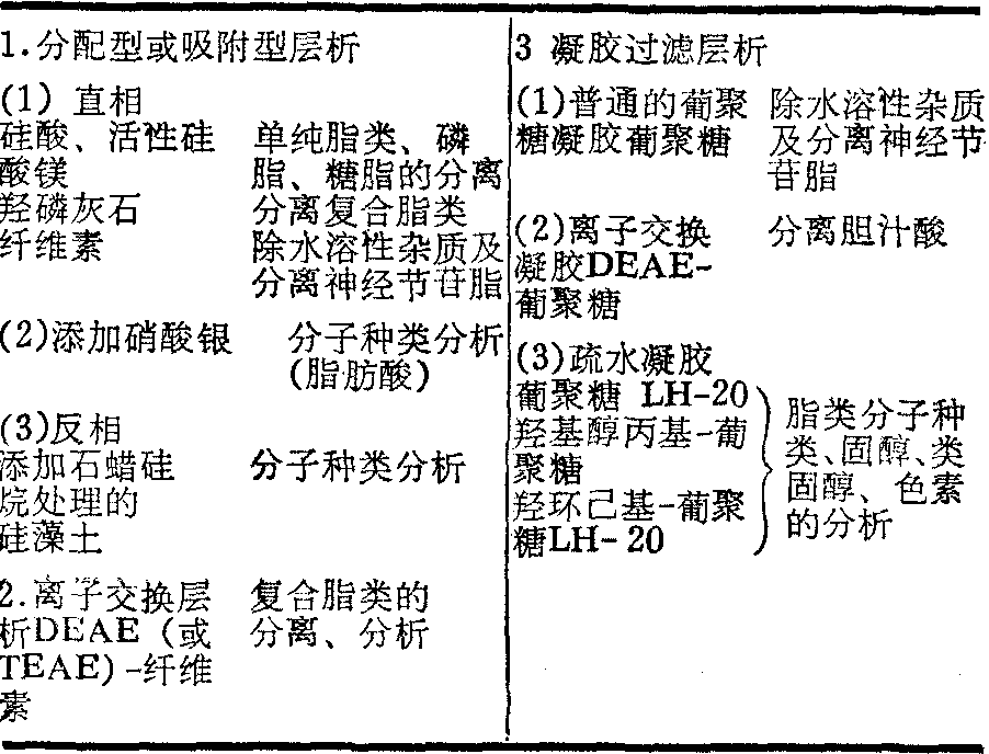 图2 血清磷脂的薄层层析 溶剂系氯仿:甲醇:乙酸:水(50:25:7:3V/V/V/V) 非酯化脂肪酸亦可用薄层层析法进行分离,但必须先甲酯化,或先在板上添加硝酸银等试剂。薄层层析不但可以应用于一般脂类的分离、鉴定,而且可用于脂酶系反应产物和反应速度的检测。 柱层析 柱层析包括吸附、分配及离子交换层析等。其用途如表3所列。 表3 柱层析的种类和用途