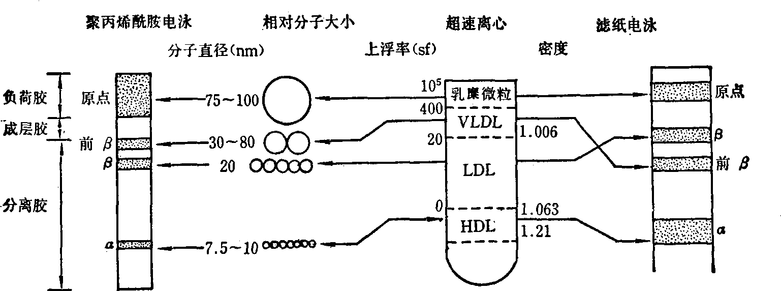 图3 三种分离脂蛋白方法的比较 脂蛋白的分析 (1)超速离心法: 超速离心法是血清(浆)脂蛋白分类的依据之一,也是分离、提纯和鉴别高分子物质的重要技术。一般用氯化钠、溴化钠、溴化钾、氯化铯及蔗糖等水溶液为溶剂。常采用的是NaCl-H2O系(为防止脂类的氧化,内含10-3~10-4molEDTA-Na2)。 各类脂蛋白的蛋白质和脂类含量不同,密度各异,因而就有不同的沉降或漂浮速率。根据血浆脂蛋白的上浮率(Sf),一般将它们分为乳糜微粒(CM)、极低密度脂蛋白 (VLDL)、低密度脂蛋白 (LDL)及高密度脂蛋白(HDL)四大类,各类中又可以分为若干亚类。一个Sf是指脂蛋白在密度为1.063的盐溶液中,26℃时上浮率为10-13cm/s/dyn/g。脂蛋白含脂类成分越多、蛋白质成分越少,其密度越小,Sf值越大。 超速离心分离后的脂蛋白可以进行电泳,脂类提取、脂类定量和蛋白质定量等项分析,但高浓度的盐类存在可以干扰测定,必须先经透析除去。超速离心、聚丙烯酰胺和纸上电泳分离脂蛋白以及其分子量大小、密度的关系,如图3。 (2) 电泳法:脂蛋白电泳法与其他蛋白质电泳一样,可用滤纸、醋酸纤维素、淀粉胶、琼脂、琼脂糖胶和聚丙烯酰胺类作支持物。但是,脂蛋白电泳时必须使用较低浓度的琼脂糖胶、聚丙烯酰胺等凝胶,而琼脂对LDL和VLDL的分离不够满意,不宜采用。另外,用加入适量清蛋白的巴比妥缓冲液(pH8.6,离子强度0.1)分离效果良好,尤其对VLDL的分离。 各类脂蛋白的载脂蛋白不同,所带净电荷量和颗粒大小亦不相同,故在一定的电场强度下,其电泳迁移率不同。但用不同支持物进行电泳时,同一脂蛋白的电泳迁移率也不尽相同(表6)。 (3) 沉淀法:多价阳离子沉淀法是常用的沉淀法之一。VLDL和LDL因含有带正电荷较多的赖氨酸和精氨酸残基的载脂蛋白,可与多价阳离子的硫酸多糖类 (如硫酸葡聚糖、肝素、硫酸支链淀粉等)形成不溶性复合物。2价金属离子(Mg2+、Ca2+、Sr2+及Mn2+、Co2+、Ni2+等)、pH和离子强度是不溶性复合物形成的重要因素。一般生成沉淀的pH为6.5~8.5。复合物的溶解度易受脂蛋白与多价阴离子之间相对浓度的影响,故需避免多价阴离子的过剩和脂蛋白浓度的过高。在上述条件下形成的不溶性复合物沉淀,其浊度在一定范围内与VDL及VLDL的含量成正比。此沉淀物相当于超速离心法Sf0~400的脂蛋白。这种沉淀物能溶于含Na2-EDTA的5~10%氯化钠溶液(pH7.0),因此可以利用这一性质来纯化脂蛋白。 表6 血浆脂蛋白的泳动位置(pH8.6)
