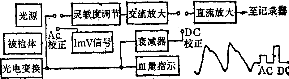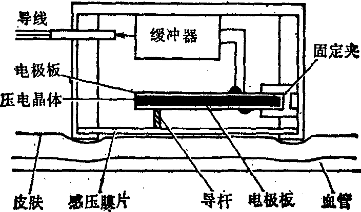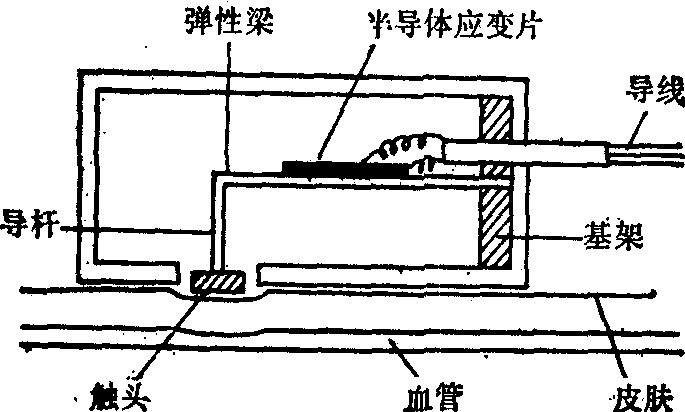释义 | 脉搏测量 脉搏测量从较表浅的动脉可以触知血管搏动。一般检查手腕内侧靠拇指侧的桡动脉搏动,其他位置表浅的动脉节段尚有颈动脉(颈前部喉头水平两侧)、股动脉(大腿根部偏内侧)及颞动脉(太阳穴部位)等。中医切脉为重要的检病诊断手段,西医触换脉搏主要了解心跳的速率及规律性。老年人有时感到一过性心慌,此时可以自己触摸桡动脉观察是否有心跳不规整现象。于安静时偶然出现脉搏不规整一般无严重病理意义,如经常发生则应进一步检查心脏。 ☚ 血压测量 视力测量 ☛ 脉搏测量 脉搏测量动脉血管随心脏收缩与扩张而周期性搏动的现象,称为脉搏。在脉搏中,包含着血管内压、容积、位移和管壁张力等多种物理量的变化。脉搏的测量,是采用某种方法检测脉搏现象中包含的物理量的变化。由传感器所检测出的这种变化信号,称为脉波。使用适当的记录或显示装置,可以描记出脉波的变化曲线,这种检测并记录脉波的装置,称为脉波计(脉搏计)。 图1 半导体应变片式脉搏传感器 压电晶体式压力脉搏计 它采用压电晶体作为压力敏感元件,直接将其感受的压力变换成电压信号。常用的压电晶体有酒石酸钾钠和钛酸钡等。在传感器中,压电晶体嵌在固定夹间,经连杆与弹性感压膜片相连接。感压膜片与生物体的耦合可采取直接接触或空气传导的方式,血管的压力搏动经感压膜片传至压电晶体。压电晶体产生的电压信号经导线送至高输入阻抗放大器放大后输出。由于压电晶体输出阻抗很高,为提高抗干扰能力,还往往将阻抗变换电路(缓冲器)置于传感器内。一种接触型压电晶体式脉搏检测方法如图2所示。其低频特性差,波形失真较大。 图2 压电晶体式脉搏传感器 光电式容积脉波计 它采用光电变换方式检测容积脉波。一般是将光电传感器安装在指尖或耳廓等适当部位,用对动脉血中氧合血红蛋白有选择性的一定波长的光照射被测部位,再由光电变换元件接收经组织透射或反射的光,并变换为电信号,送至放大器放大和输出,由此反 图3 光电式容积脉波的测量 映动脉血管容积的变化。其测量方法如图3所示。传感器的光源最好采用发光二极管,其光谱选为6,000~7,000A,以主要反映动脉血管的容积变化; 但在要求不高的情况下,亦可用白炽灯作光源。光电变换器主要有光敏电阻、光电池和光敏晶体管等光敏元件,其中硅光电池的输出线性好,可选择适当的感光光谱,且不需供给电源,故为较好的光电元件。为防止光源热量对血管状态和半导体光敏元件灵敏度的影响,除可采用发光二极管外,现已出现由光导纤维与远离的光源相联接的方法,它允许适当增加光源强度以提高传感器的灵敏度。光电脉波传感器固定于被测部位时,要用遮光套屏蔽外来光线,且应保持感光面与皮肤间有稳定而适当的压力,以防止波形畸变和幅度不稳。硅光电池应避免强光和高温,以防性能变坏或寿命缩短。 为比较不同组织含血量条件下(如胖瘦不同、肢体粗细不同等)的容积脉波数据,一般需用组织含血量为校正参数,以得到单位组织含血量的容积变化量。一种便于进行组织含血量校正的光电式容积脉波计是所谓二次校正式光电脉波计,其方框图如图4所示,其中AC校正用以校正电路系统的灵敏度,DC校正用以校正组织的含血量。此外,还有一种脉波计能直接显示单位血量的容积变化量。 图4 二次校正式光电脉波计方框图 光电式容积脉波计结构简单,易操作,适于细小动脉和微血管床的脉搏测量,频率特性较好,故应用较广泛。其缺点是传感器的固定较困难,易造成波形不稳和畸变。 水银应变计式容积脉波计 它以水银应变计作为容积脉波传感器。一种常见的传感器形式是在具有良好弹性和柔顺性的橡胶管中,充满水银,水银柱两端经电极与外导线连接,橡胶管被缠绕于肢体上,其长度随着因动脉血管容积变化引起的肢体周长的变化而变化。设水银液体的电阻率为ρ,总容积为V,则其电阻值R与被测肢体周长l的关系为R= ![]() 另一种传感器是在乳胶膜封口的倒立玻璃漏斗中盛入水银,漏斗边缘和乳胶膜与被测部位皮肤接触,皮肤下被测血管的容积变化经乳胶膜引起漏斗玻璃管中水银柱高度的变化,用适当的电桥放大器系统可以检测水银柱高度的变化。这种传感器的特点是可以检测特定的浅表动脉容积变化,但传感器的固定较困难,使用不便。 电阻抗式容积脉波计 它通过检测选定区段的组织电阻抗变化来测量容积脉波。随着组织内动脉血管容积的变化,其中容纳的血液量亦相应变化,从而造成一定区段血管所在部位组织的总电阻抗的变化,容积变化与阻抗变化成比例(参见“生物电阻抗的测量”条)。电阻抗式容积脉波计的优点是,基本上排除了固定传感器的困难,重复性好,简便易行,适于长时间连续测量。但是,呼吸和皮肤出汗等因素也会造成记录波形的基线不稳,需采取措施防止和克服。 ☚ 心音测量 体温测量 ☛ |