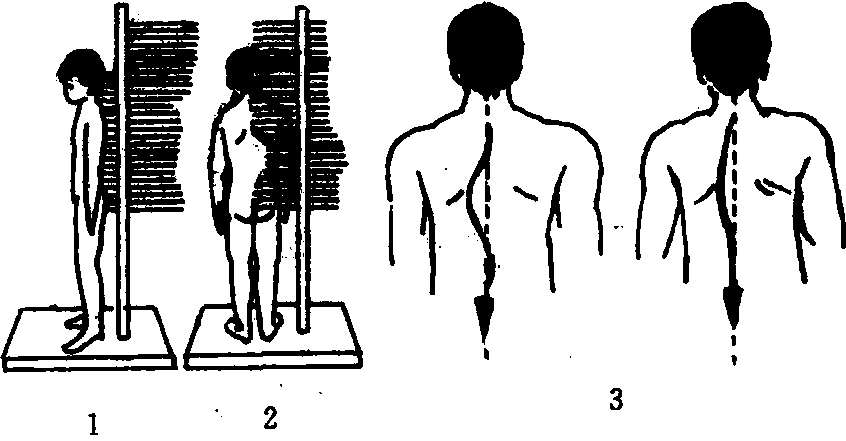 以移动的木棍制成的。检查时,受试者只穿短裤,站在测量器的台板上,背靠立柱;测量者移动小木棍,使其一端贴紧受试者的棘突,然后从木棍另一端的连线即可看出脊柱的弯曲情况。脊柱的正常生理弯曲是颈前凸为3—3.5厘米,如果大于此标准,则为胸椎后凸,小于此标准则为胸椎前凸。正常的腰前凸为3.5—4厘米,如果大于此标准,说明腰椎前凸,小于此标准说明腰椎后凸。用同样方法,也可以测量脊柱侧弯。