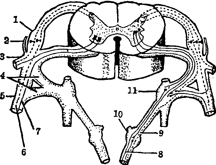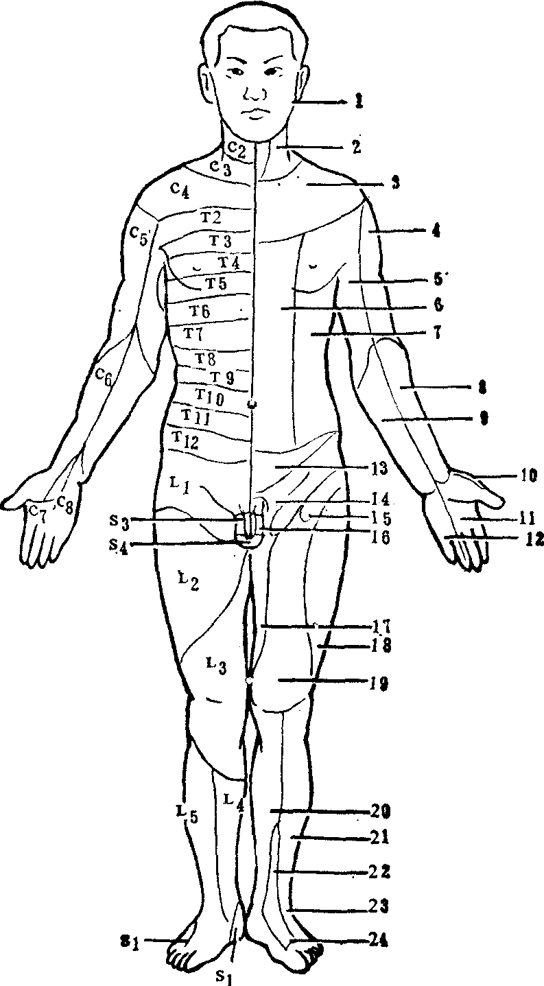 图2 脊神经的节段性分布及周围支的分布区(腹侧) 脊神经出椎间孔后立即分为前支、后支和脊膜(返)支。脊膜支细小,由椎间孔返回椎管,分布于脊膜、椎骨骨膜、椎骨、椎间盘和韧带。上三对脊神经的脊膜支还分布于颅后窝的硬脑膜。前支粗大,分布于躯干前部、外侧部、四肢和会阴的皮肤、关节、韧带和肌。前支中除胸2~11对以外,其余均分别构成颈丛、臂丛、腰丛和骶丛。后支一般比相应的前支细而短,主要按节段分布于背部的皮肤、筋膜、韧带和肌。第1颈神经的后支名枕下神经,分布于枕下肌。第2颈神经后支的内侧支,名为枕大神经,分布于枕部的皮肤。腰1~3以及骶1~3后支的外侧支分别分布于臀上部和臀下部的皮肤,称为臀上皮神经和臀中皮神经。骶4~5和尾神经的后支,分布于尾骨周围的皮肤。在前支的起始处附近,有交通支与交感节相连。 ☚ 反射弧 脊神经的节段性分布 ☛ 脊神经spinal nerve |