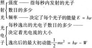 注意 (1)光束的强度与光子的能量不能等同 (2)光电子的最大初动能与光电流大小不能等同; (3)光电子的最大初动能与初动能是有区别的. 例 用同一束单色光,在同一条件下先后照射锌片和银片,都能产生光电效应,在这两个过程中,对于下列四个量,一定相同的是__可能相同的是__一定不同的是__. A.光子的能量 B.光电子的逸出功 C.光电子动能 D.光电子最大初动能 分析 光子的能量由光频率决定,同一束单色光频率相同,因而光子能量相同.逸出功等于电子脱离原子核束缚需要做的最少的功,因此只由材料决定,锌片和银片的光电效应中,光电子的逸出功一定不相同. 由Ekm=hv—W,照射光子能量hv相同,逸出功W不同,则电子最大初动能也不同.由于光电子吸收光子后到达金属表面的路径不同,途中损失的能量也不同,因而脱离金属时的可能动能分布在零到最大初动能之间,所以,两个不同光电效应的光电子中,有时初动能是可能相等的. 答 一定相同的是:A;可能相同的是:C,一定不同的是B、D. |