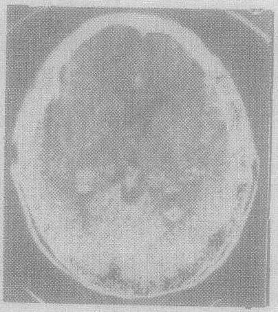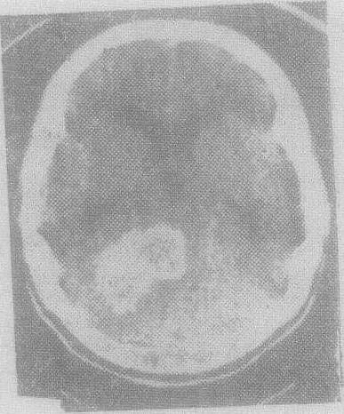 颅内各种病变,由于其组织密度不同,对X线吸收高于脑实质则表现为增白高密度阴影,如钙化、出血、肿瘤等。对X线吸收低于脑实质则表现为灰黑低密度阴影,如坏死、水肿、囊肿、脓肿、肿瘤等。还有病变对X线吸收和脑实质相似的,则表现密度相同。为了提高CT扫描的分辨率,可给病人静脉注射含碘造影剂(成人可给60%泛影葡胺100ml),增强病变组织和正常组织间的密度对比,提高诊断率。此外,脑室和脑池的形态变化,亦有助于颅内疾病的诊断。下面对颅内各种疾病作简单评价。 肿瘤 CT扫描对颅内肿瘤的诊断价值较高,依据肿瘤组织对X线吸收系数可高于、低于或等于正常脑实质,肿瘤的占位改变可引起脑室和脑池移位,反映出肿瘤的位置。静脉注射造影剂增强,使血液丰富的肿瘤更清晰显示其形态和位置(图2),更能显示和脑实质相等的脑肿瘤。肿瘤外围有水肿