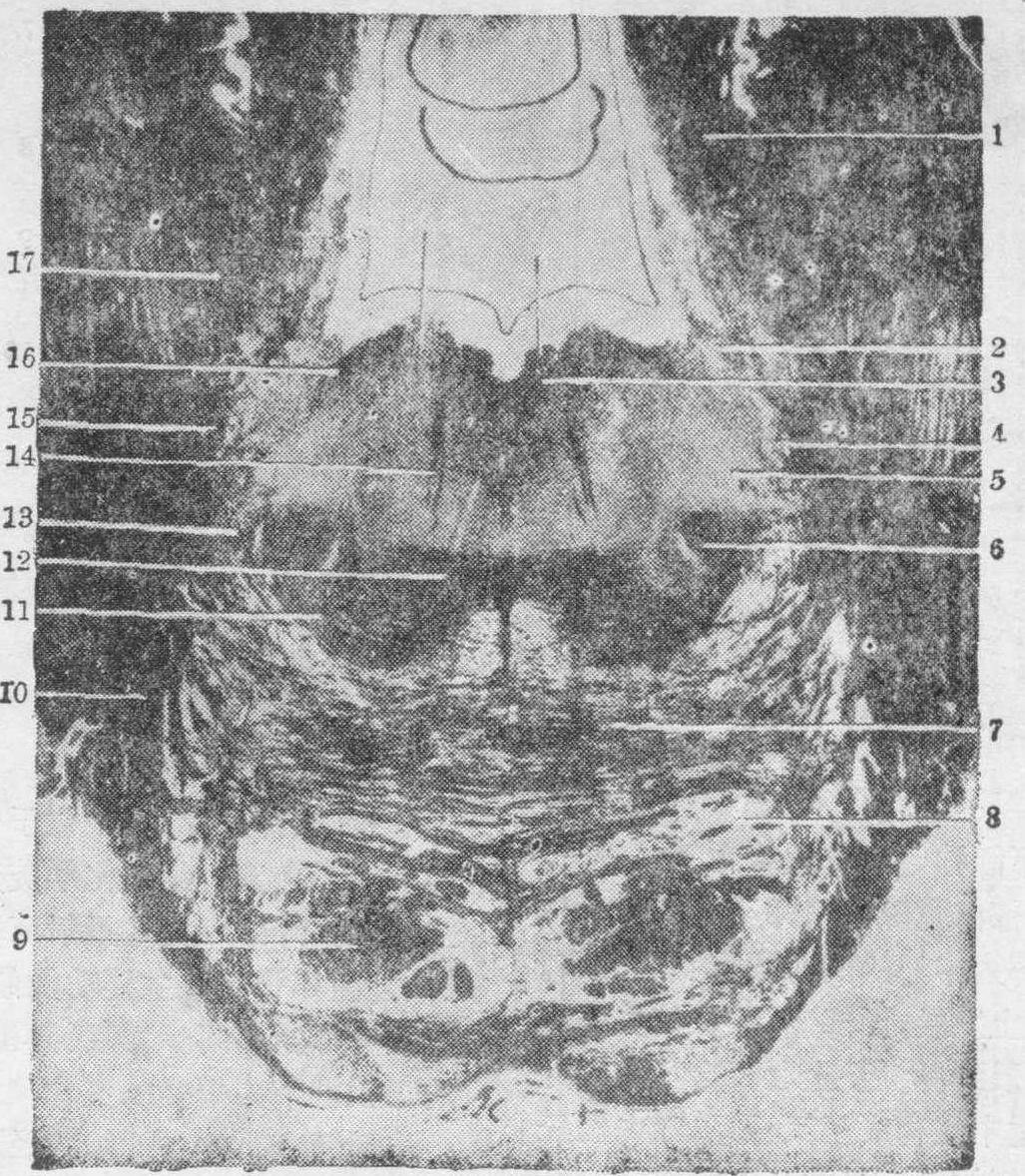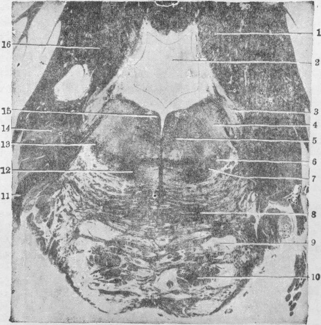 核 5. 面神经核 6.上橄榄核 7. 脑桥横纤维 8. 脑桥核 9. 锥体束 10. 小脑中脚 11. 斜方体 12. 内侧丘系 13.外侧丘系 14. 展神经根 15. 三叉神经脊束 16. 面神经 17.前庭小脑纤维神经入脑桥,止于孤束核上端(味觉核)。