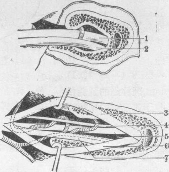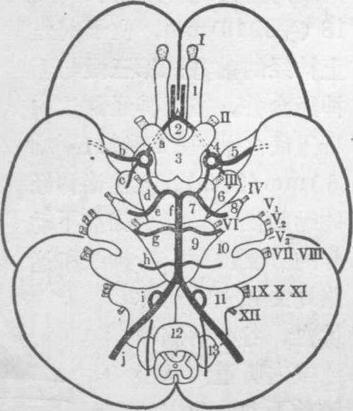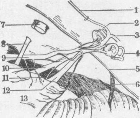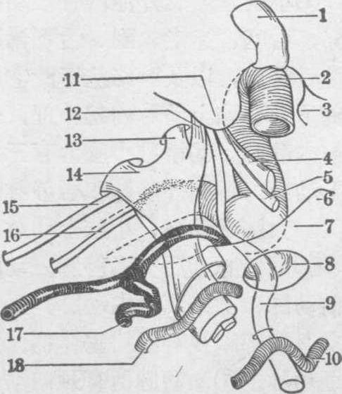 释义 | 脑的显微外科解剖 脑的显微外科解剖通过手术显微镜观察,并适用于显微神经外科的脑部解剖学,称为脑的显微外科解剖。现按不同部位分区介绍之。 图1 海绵窦 海绵窦外侧壁、中颅窝底部分硬脑膜已切除 1. 视神经 2.颈内动脉 3. 眼支 4. 上颌支 5.下颌皮 6.鞍背 7.动眼神经 8. 滑车神经 9. 外展神经 10. 三叉神经 11.半月节 Willis脑底动脉环前部由两侧大脑前动脉和前交通动脉组成,它们在视交叉或视神经的上方汇合。通常汇合点近侧的大脑前动脉用A1表示,远方用A2表示。A1段的直径平均2.6mm; 长度不定。前交通动脉长2~3mm,直径平均1mm。大脑前动脉与前交通动脉可有下述变形:一侧大脑前动脉发育不良者见于7%的人体,前交通动脉发育不良见于6%。前交通动脉只有一根者见于60%,有两根者见于30%,三根者见于10%。A1段呈双者少见,见于1.5~10%,从前交通动脉发出第三根动脉,位于两侧A2之间,称为Wilder端末动脉。Heubner回返动脉:从A1段或A2段的近端0.5mm内发出,在A1外侧反向行进,再与大脑中动脉伴行,进入前穿质(39%)及(或)侧裂。其直径平均1mm。沿途发出分支,分布于尾核前部、壳核前1/3、苍白球外侧部和内囊前支。其它穿动脉: 自A1、A2和前交通动脉分出,分布于前穿质、额叶底面、视交叉背侧部、视径、视上区、外侧裂近方。A1有2~15分支,前交通动脉有0~4分支,A2较少。 Willis脑底动脉环后部由两侧后交通动脉和大脑后动脉汇合而成; 基底动脉上段和脉络膜前动脉也包括在内。 基底动脉: 分叉点变异很大,大多数位于脚间窝 (88%),低位者可在桥脑上缘 (10%),高位者在乳头体前部(2%)。基底动脉上段1cm内穿支很多,平均8个,直径0.1~0.5mm,进入中脑。 大脑后动脉近段(起始点至后交通动脉汇合点):有1~13个穿支,较常见的4个穿支是: ❶丘脑穿动脉是最大的分支,由后穿质进入间脑。 ❷内侧脉络膜后动脉分布于丘脑、第三脑室脉络丛、侧脑室脉络丛。 ❸四叠体动脉至四叠体。 ❹至大脑脚和中脑被盖的分支。大脑后动脉远段(后交通动脉汇合点的远侧): 重要穿动脉有丘脑膝状体动脉,分布于丘脑外侧核群的后部。 后交通动脉: 平均有7个穿支,直径0.1~0.6mm,分布于灰结节、后穿质、视束、大脑脚、乳头体、视交叉和脚间窝,并供应下丘脑后部、丘脑前部、内囊后支和底丘脑。较大穿支中的80%分布于乳头体与视束之间,最大的一个分支称乳头前动脉,供应丘脑前,外部和丘脑下部前、外部。 脉络膜前动脉: 多数从颈内动脉分出,起始点位于后交通动脉起始点的远方2.7mm处,离颈内动脉分又数mm。分布于: ❶颞叶钩回、梨状区和杏仁核; ❷视束、外侧膝状体和视放射; ❸内囊膝部和后支、苍白球内侧核、尾核尾部; ❹丘脑外侧核群、底丘脑; ❺大脑脚中1/3和黑质。 颈内动脉的直接穿支: 在后交通动脉起点的远侧,常有2~3个穿支进入视束、视交叉、视神经、下丘脑前部、前穿质和颞叶内侧部。 脑底动脉环后部的变形: 如果后交通动脉近段的直径比后交通动脉大,就认为脑底动脉环后部是正常的,占54%。变形包括: 后交通动脉发育不良(占32%),后交通动脉近段发育不良(占22%)。 岩尖与邻近的神经有: ❶外展神经,经Dorello管进入海绵窦。此管位于Gruber岩床韧带、岩尖和鞍背三者之间。有时外展神经在进入此管前分裂成几根,有些根丝从岩床韧带的上方进入海绵窦(图2)。 ❷三叉神经的节后部份,位于岩尖外侧的三叉切迹中。在其前下方,颈内动脉在岩骨内通过。在半数人中,动脉与神经之间没有骨壁分隔,以致从三叉神经根的外侧缘向外,颈内动脉仅由硬脑膜覆盖。岩上窦通常在三叉神经根的上方通过,但也可分成两支,在Meckel 腔的开口处将三叉神经根包围。三叉神经的节后部分由大根、小根和中间根三部份组成。大根传导面部痛觉和温度觉; 中间根传导轻触觉,可能参与角膜反射; 小根传导三叉神经运动功能。在桥脑侧池中,三叉神经根的这三部份可以清晰区别(图3)。此外,就大根而言,在其进入桥脑之前,可约略区分为三部份,相当于眼支、上颌支和下颌支。 ❸岩大浅神经,进入破裂孔后,参与颈内动脉四周的交感神经丛,形成Vidius翼管神经,进入翼管。 ❹岩小浅神经,由鼓室穿出,到达岩骨上表面,位于岩大浅神经的外侧,平行向前,进入卵圆孔或Arnold无名小管。 图2 左鞍旁和岩尖附近结构 1. 视神经(切断后翻向前) 2. 颈内动脉 3. 中床突 4. 动眼神经5. 滑车神经 6. 后床突 7.Gruber韧带 8. Dorello管 9.外展神经 10. 小脑前下动脉 11.前床突 12. 三叉神经眼支 13.三叉神经上颌支 14. 三叉神经下颌支 15. 岩小浅神经 16. 岩大浅神经 17. 岩静脉 18. 小脑上动脉 图3 右侧三叉神经根 1.小根(运动根) 2.中间根 3. 大根(感觉根)分 内听道和有关的神经与血管: 内听道内有五根神经,即: 面、前庭上、前庭下、耳蜗和中间神经,它们都从桥脑发出,经桥脑侧池进入内听道。在内听道的外侧段,这五根神经的位置较有规律。内听道的外端由横嵴分为上、下两部,每部分各有小孔两个。面神经和前庭上神经进入上部的两孔,面神经在前称面神经管,前庭上神经在后,二者又由一纵嵴分隔。耳蜗神经和前庭下神经别进入下部的二小孔,耳蜗在前称螺旋孔束,前庭下神经在后。中间神经则位于面神经与前庭神经之间。面神经进入面神经管数毫米后,就形成膝状神经节,再转向后,在外侧半规管后下方,下行于中耳的后壁,出茎乳孔到达面部。从膝