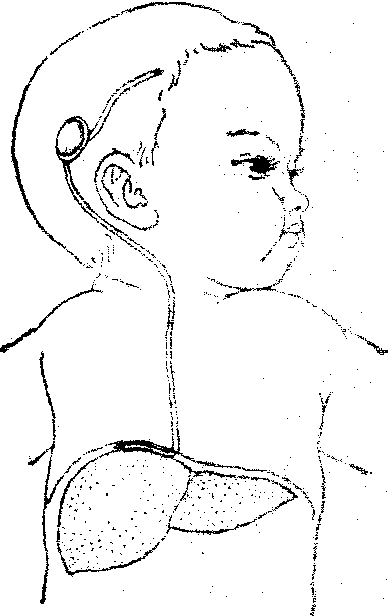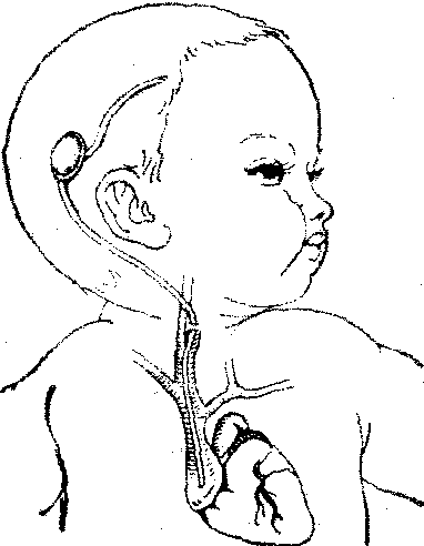 ❷手术中无X线拍片设备者,可用下法:术前拍胸片,测左侧锁胸关节到胸椎6~7的距离; 术中测颈部切口到锁胸关节的距离。前两段距离相加等于颈部切口到心房的距离,即心房管该插入的长度; 心房管接上补液,观察补液滴入速度的情况,当心房管进入心房时,滴入的速度加快。如果心房管进入心室时液体滴入停止。心房管退至滴入速度最快处即为心房内; 当心房管插至上腔静脉时出现缓脉及血压下降,到右心房内时又回复正常,再深入到心室则出现期外收缩,将管端退到右心房时又回复正常; 用Robertson的心电图法更为正确,在补液针头接上心电图导线,再接上心房管,管内充生理盐水,就可以记录心内心电图,当心房管端进入上腔静脉时P波倒置,管端进入心房时P波呈双相,管端接近心室时P波正立,ST段上升。手术方法:病人仰卧,头转向左,背下垫高暴露颈部,头部切口从右耳轮上4~5cm向后4~5cm颅骨平坦部切开一小皮瓣并钻孔。将脑室管插入侧脑室内,接上阀门,并将阀门置入皮瓣内侧预先凿好的颅骨槽内,以便固定整个阀门。右颈部切口,在胸锁乳突肌的前缘,下颌骨角下1cm左右。暴露面总静脉和颈内静脉,心房管自面总静脉插入,用上述心房定位法,将心房管调整在胸椎6~7水平,即在心房内,并将心房管固定在面总静脉上,心房管上端通过皮下阀门相接固定(图1)。