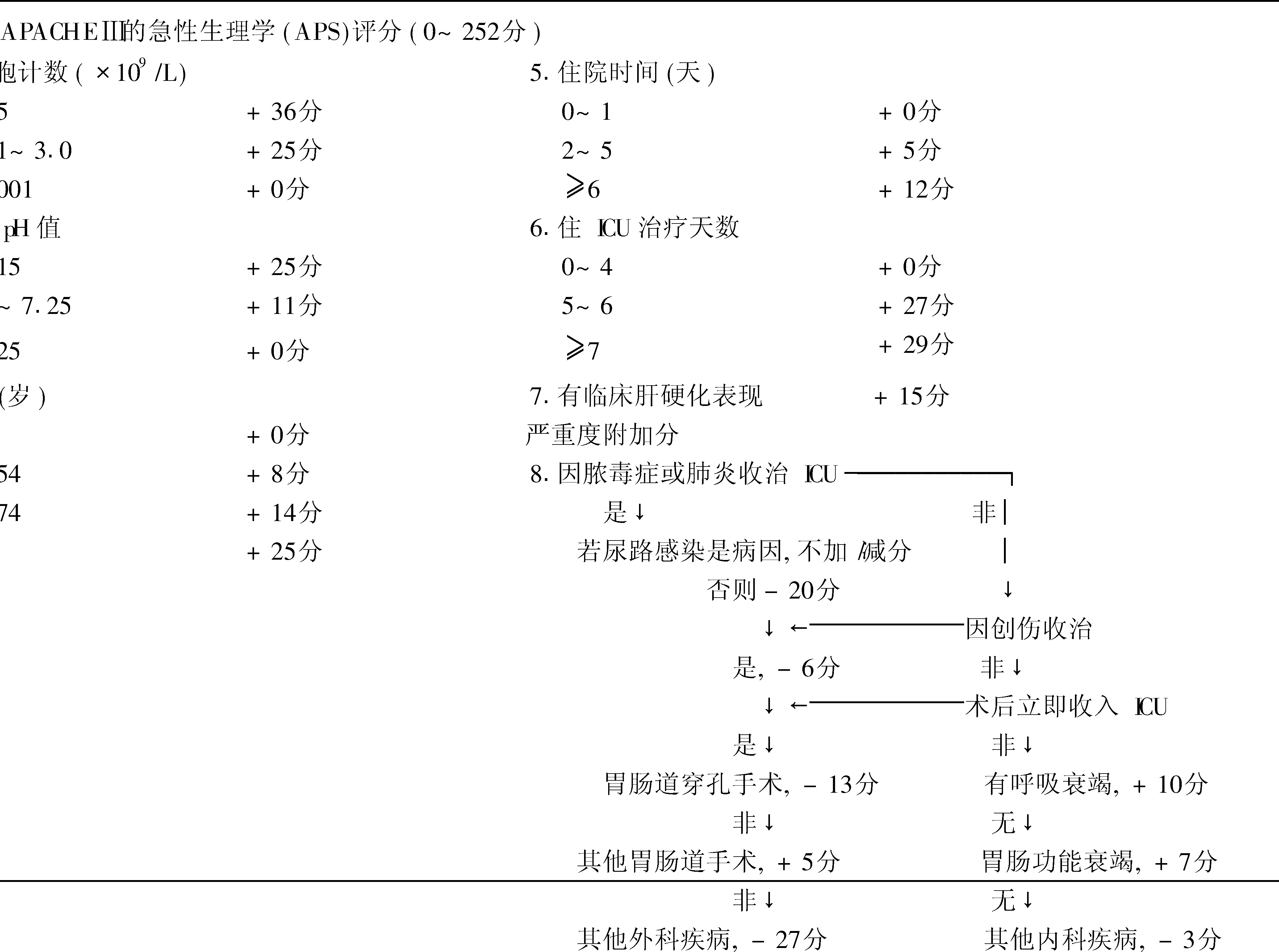 1993年Knaus等在分析1195例病人危险因素后提出,该评分对进入临床3期药物验证的脓毒症病人能作出更为准确、客观的病情评定。其中原版本的急性生理学评分(APS)仍作为影响预后最重要的因素,另外包含年龄、收住ICU及在院治疗时间、病因诊断计分等。此外收入白细胞计数、血清pH值2项指标,更能提高评定精确度。APS与其余各项参数附加分总和即脓毒症严重度总积分,为0~404分,分值高低表明了死亡风险大小(见下表)。