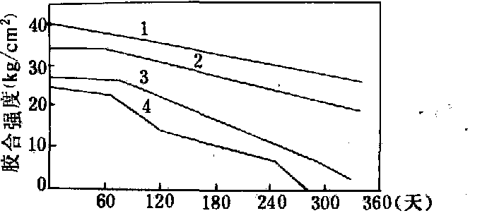 降低脲醛树脂胶及其制品中甲醛释放量由于脲醛树脂是高分子物质的初期缩合物,所以除具有各种分子构造的缩合物之外,尚含有部分游离甲醛。另外在树脂进一步固化过程中还放出甲醛。因此,脲醛树脂无论在人造板的板坯热压时或产品进行加工、使用时都会散发出刺鼻的甲醛臭味,污染环境,限制了产品用途,因此需要减少甲醛的释放量。常用的方法有:❶在制造树脂时,尿素与甲醛采用低摩尔比,并进行减压脱水。 ❷加入游离甲醛结合剂,如尿素、三聚氰胺、间苯二酚等。 ❸在配胶时,加入增量剂,如蛋白系增量剂,可与游离甲醛结合成为不可逆的、不溶性物质。 ❹对产品进行后处理。如用氨气处理板材;对产品表面进行涂饰或封闭处理等。 脲醛树脂改性 脲醛树脂在反应过程中生成各种缩合度的分子,而这些分子即使是在适当的pH和温度条件下的最终固化物,仍含有一定量的游离羟甲基,羟甲基具有亲水性和遇热进一步缩聚而分离出甲醛和水的可能性。这就是脲醛树脂胶耐沸水性能差和胶层易老化的原因。为了改进这些缺点,通常是在脲醛树脂中加入适量的三聚氰胺树脂(或三聚氰胺粉末)、苯酚、间苯二酚、血粉等物进行改性(表3),使其耐沸水性、耐老化性能有显著提高(如图)。 室外曝露时间与胶合强度变化曲线图 表3 改性剂加入量与胶合性能的关系