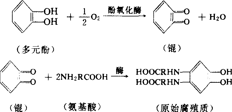 ❷腐殖质组成物质经缩合而形成新的高分子化合物——原始腐殖质。其式为: