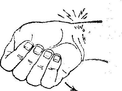 (2)桡骨茎突部腱鞘炎:多见于小口径步枪运动员的托枪手和举重运动员,后者与练习锁握动作有关。桡骨茎突部腱鞘是拇伸短肌和拇展长肌肌腱的总鞘,位于由腕横韧带和桡骨茎突上骨凹构成的管道内,此管小而无弹性。总鞘中有时有一纵隔将两腱分开。当腕背伸桡偏时,该腱折屈成角,加上两个腱的活动不完全一致,在鞘内互相磨擦,如果局部负担过大,久之即成腱鞘炎。发病时,桡骨茎突部或拇指周围有压痛,重者向前臂或肩部放射。拇指活动受限。严重时影响训练甚至睡眠。检查桡骨茎突部可有轻度肿胀、压痛、局部肥厚。Finkelstein试验阳性(见图2)。