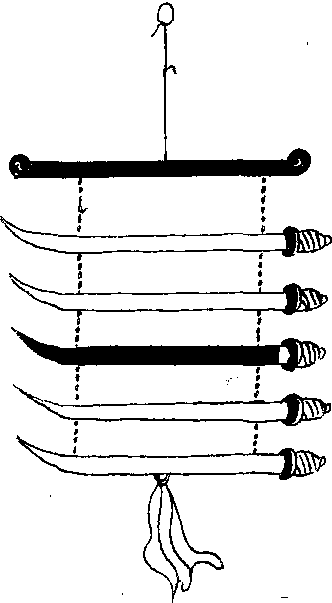 幌子 此幌是用木头制成,在一横下,挂有红、蓝、黑三种不同颜色的腰刀,下方吊有一块红布,以此来表示店内出售各种腰刀。