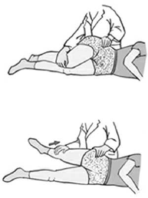❶病人左侧卧位,右下肢伸直。检查者站立于病人背后,右手扶持于病人右膝关节的前方,并向后推动右下肢,左手同时从病人后方推顶其臀部或髂部,病人出现右下腹痛。