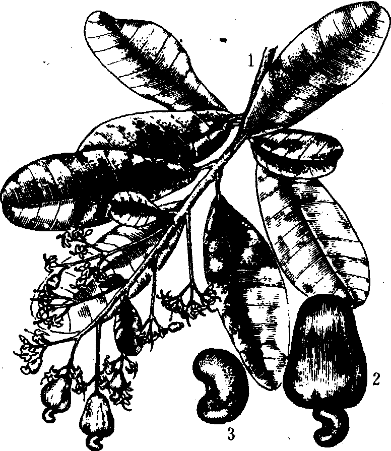 释义 | 腰果cashew nut漆树科腰果属热带常绿果树, 乔木。又名槚如树、介寿果。学名Anacardiumoccidentale L.。 腰 果 品种类型 各主要产区仅种植一种, 但树形有高有矮, 种壳有薄有厚, 坚果大小、果梨颜色或形状等以及品种类型间均有差异。栽培品种巴西最多。 栽培技术要点 用种子或嫁接繁殖, 以嫁接繁殖最好, 多用补片芽接法嫁接(方法与杧果同)。播种前浸种24小时, 用果蒂向上的立播法发芽较快。种植密度中国海南株行距8米×8米。幼树以氮肥为主,并适当配合少量的磷钾肥和有机肥。结果树要提高磷钾肥的比例。主要病害有花序疫病、炭疽病、梢枯病等, 对生产尚未造成威胁。主要虫害有茶角盲蝽、果螟、天牛和蓟马等, 要及时防治。 种植后2年开花,3年结果, 8年后进入盛果期,盛果期15~25年。在中国海南花期为12月至次年4月,4月中下旬果实开始成熟。如要利用果梨,得每天采收,否则每3~5天收集落地果, 去掉果梨晒3~4天即可包装贮藏。 经济价值 腰果仁含脂肪44~47%,蛋白质20%,碳水化合物22~29%。多用于制腰果仁巧克力、点心和油炸盐渍食品。果仁油为上等食用油。果梨含丰富的维生素C, 可加工果汁、果酱、果冻或酿酒。果壳含壳液约40%, 是制高级油漆、彩色胶卷着色剂和合成橡胶的原料。中国海南南部具备较好的发展条件。 腰果腰果又名树花生,属漆树科常绿乔木,高6—12米,树干直立,树皮粗糙,老时深裂;枝繁叶茂且扩展,叶卵圆形,革质、互生,叶脉明显。圆锥花序顶生,花小型、杂性,粉红色,芳香。果实有两部分: (1) 大而肉质梨状的柄,由花托发育膨大而成,淡红色或黄色,长8—10厘米,汁液有收敛性的酸味,通称果梨。(2) 小腰形坚果,着生于花托上,灰色或棕色,因果形酷似“腰子”而得名。果长2—3厘米,壳坚硬,内有种子一枚,种皮色似花生,种仁白色,占果实重量35%。花期11月至次年2月,果期5—6月。热带木本油料作物——腰果,原产巴西东北部,海南岛种植腰果已有50多年历史,现在全岛种植腰果面积15万亩左右,产区海南省黎族地区西南部的乐东、东方、昌江和陵水、万宁、三亚市的滨海等地,一棵棵腰果树,象一把把撑开的绿色巨伞,散落在路旁、村边、沙滩、坡岗,一片连着一片,汇成绿色的群落。一些低矮的植株,枝叶匍匐到地面,一丛接着一丛,远看,就象是一个个绿色“蒙古包”,别有一番景色。腰果耐旱、耐瘠,对热带环境适应性强,在高温地区既能适生于肥沃潮湿的土壤,又能耐干旱瘠瘦的沙地,但幼年忌5℃以下的低温。成年结果树也会因低温而遭到不同程度的伤害。腰果繁殖有两种方式: 一是有性繁殖; 二是无性繁殖。一般采用靠接、空中压条法和芽接法试验繁殖,已获得成功,今后有可能大面积采取高产芽接树代替低产实生树。 腰果cashewAnacardium occidentale L.,又称槚如树。漆树科,腰果属。常绿乔木。2n=42。原产美洲热带地区。主产印度、巴西、东非,中国海南、广东、云南和福建南部等地有引种。植株高大。树冠开张。单叶互生,革质,长圆形或倒卵形,全缘。雌雄同株,顶生圆锥花序,花有雄花和两性花。果实为坚果,肾形或心形,长约2.5 cm。用坚果直播、嫁接、压条繁殖。种仁含油量达40%以上,蛋自质15%以上。可炒食、榨油以及作加工食品原料,花托肉质亦可食用。 腰果 腰果漆树科腰果属常绿乔木。原产于美洲热带,全属共8种。中国于1943年引入。树高8~12 m,树冠开张,冠幅约8 m。单叶互生,长10~20 cm,宽5~10 cm。中国近年引种成功的木本油料之一。只有本种世界各地作干果引种栽培。花杂性,雄花与两性花同株。圆锥花序,花直径6 cm,花萼5裂,花瓣5片。坚果肾形或心形,长2~3 cm。花期3~4月,果熟期5~6月。腰果喜高温,月平均温度15℃时生长缓慢,3~5℃时开始出现冻伤。果仁含脂肪45%,蛋白质20%,单宁15%,还原糖7%~9%,可溶物质11.7%。嫁接育苗,3年结果。印度、巴西、东非是主产地。中国海南、广东、云南有结果大树。 |