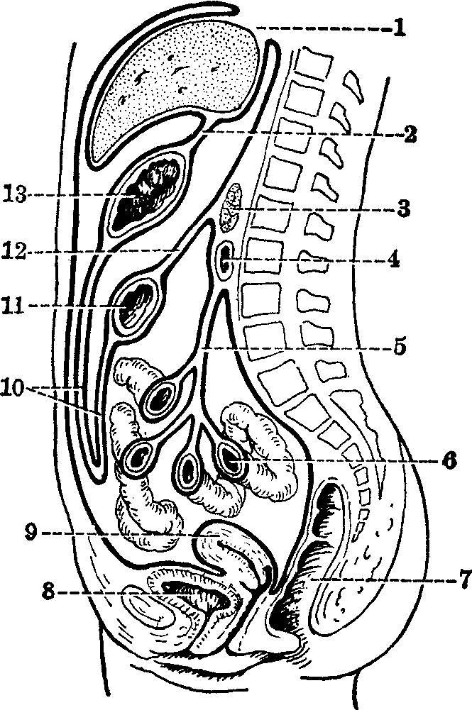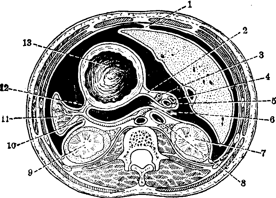 图2 腹膜腔上部横切面 1. 肝镰状韧带 2.肝十二指肠韧带 3. 肝固有动脉 4.胆总管 5.门静脉 6.网膜孔 7.右肾 8.下腔静脉 9. 左肾 10. 脾肾韧带 11. 脾 12. 胃脾韧带 13. 胃 如脏器(常见为小肠)于腹股沟内侧窝经腹股沟管皮下环突出,则形成腹股沟直疝; 如由腹股沟外侧窝经腹环入腹股沟管,再经皮下环突出下降于阴囊或大阴唇皮下者,则形成腹股沟斜疝。由股凹向大腿卵圆窝突出者,则形成股疝,以女性多见。 ☚ 胰 呼吸器 ☛