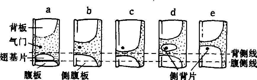 背部、背脊、背梁、脊梁、脊背;腹部、胸部○背部bèi bù(名)跟胸和腹相对的躯干的一部分:~不适|~酸疼。 ○背脊bèi jǐ(名)背部:~晒黑了 |露出一个光~|很阔的~。 ○背梁bèi liáng(名)背部:光着~|摔断了~|老人的~弯曲了 |他觉得~有一股冷风吹过|~上冒着冷汗。 ○脊梁jǐ·liang(名)〈方〉背部:古铜色的~|~骨|~发冷|挺直~。 ○脊背jǐ bèi(名)背部:~有点驼|汗水湿遍~|~上发痒|~永远挺得笔直。 ●腹部fù bù(名)在胸的下面的躯干的一部分,俗称肚子:~疼痛|~的肌肉 |~隆起|歹徒向他的~重击|往~刺了一刀。 ●胸部xiōng bù(名)在颈和腹之间的躯干的一部分:~肌肉发达|将头垂到~|一颗子弹打中了~|被害者的~受创。 腹部 腹部腹(~腔;~壁;~膜;腹胪;腹囊) 肚(肚腹;肚子;~皮;~肠;小~) 脾家 杜家村 腹的下部:小腹 少腹 脐带脱落之处:脐(脐部;肚脐;肚脐眼)太渊 特枢 昆仑 饥饿的肚子:饥肠 饥坑 饥仓 龟肠 空肠 空着的肚子:空腹 虚口 大腹:皤(皤腹;~然大腹) 大肚子 大肚皮 男子高挺起的大腹:将军肚 肚子肥满:腹便便 腹部肥大下垂:垂腴 腹部膨大的样子:便便 膨脝 膨亨 皤皤 肚子肥大凸出的样子:大腹便便 大腹彭享 ☚ 臀部 手 ☛ 腹部abdomen昆虫体躯的第三体段,内有消化、排泄等主要脏器,后端有生殖肢,是内脏活动及生殖的中心。 一般成虫腹部有10节,较进化的类群节数有减少趋势。第一腹节常趋向退化,后部几节缩入体内。多为纺锤形、圆筒形、球形、扁平或竖扁或细长。成虫腹节均由后生分节形成,后节的前缘套叠在前节的后缘内。唯软体幼虫中仍保留初生分节。节间膜和背腹板之间的侧膜都比较发达,以适应生殖活动。成虫腹部附肢大都退化,但第八、九腹节常保留有特化为外生殖器的附肢——雌性产卵器、雄性的抱器。具有外生殖器的腹节统称为生殖节,生殖节以前的腹节统称为生殖前节或脏节。生殖节以后的腹节有不同程度退化或合并,称为生殖后节。在第11腹节有一对尾须。 腹节由背板和腹板组成(见图)。只有无翅亚纲的缨尾目和少数在腹部还保留着附肢的幼期昆虫,在侧面具有附肢的肢基片(相当于侧板),气门位于肢基片和背板之间的膜上(图a),这种构造比较原始。多数昆虫成虫的腹板是肢基片和腹板愈合而成的一块骨片,从形态学上说应为侧腹板(图b)。气门则位于背板和侧腹板间的膜上。有时背板可向侧下方扩伸,将气门围在背板内(图c)。在很多幼期昆虫中,此扩伸部分又分离成游离的侧背片(图d),气门就位于侧背片上或附近的膜上。侧背片有时和腹板合并,此时,腹板实际为一个复合构造,包含侧背片、肢基片和腹板三部分(图e)。