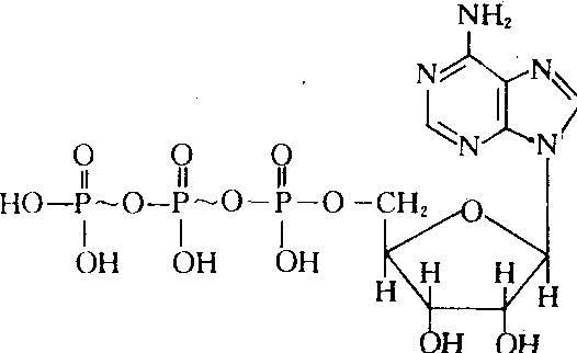 腺苷三磷酸adenosine triphosphate,ATP又称三磷酸腺苷。一种最重要的高能磷酸化合物。由三个磷酰基以焦磷酸键相连,再通过磷酸酯键与腺苷51-C连接而成。结构式如下。分子中含二个高能磷酸键,具有较高的磷酰基转移势能,水解或磷酰基转移时可产生大量的自由能。水解为ADP和磷酸时,反应的自由能变化为-30.5 kJ·mol-1 ;水解为腺苷一磷酸(AMP)和焦磷酸时,反应的自由变化为-31.8 kJ·mol-1。在生物体内,其水解放能反应常与吸能反应偶联,推动吸能反应的进行。直接为生物合成、膜的主动运输、肌肉收缩、生物运动、生物发光等生命活动提供能量。在体内,可通过底物水平磷酸化、氧化磷酸化以及光合磷酸化,从ADP合成。可作为药物用于医疗保健。