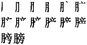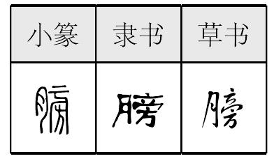 膀 金文; 篆bǎng[月(肉,意符)+旁(聲符)膀→(《説文》:“膀,脅也。從肉 (bāng)聲。”膀,胳膊的上部靠肩的部分:膀臂、肩膀。)] [明] 羅貫中《三國演義》(第五十八回):“﹝曹操﹞又見馬超生得面如傅粉,唇若抹朱,腰細膀(bǎng)寬,聲雄力猛,白袍銀鎧,手執長槍,立馬陣前。” 佚名《金瓶梅詞話》(第九十一回):“這玉簪兒走上,登時把那副奴臉膀pāng的有房梁高,也不搽臉了,也不頓茶造飯了。” 《素問·靈蘭秘典論》:“膀(páng)胱者,州都之官,津液藏焉。”(膀胱是集尿的器官) 膀(14画) ❶bǎng [髈] ❷pāng ❸páng