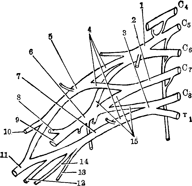 释义 | 臂丛brachial plexus系由第5~8颈神经的前支和第1胸神经的前支组成的脊神经丛。臂丛在前、中斜角肌间处发出,行于锁骨下动脉的上方、锁骨的后方,后进入腋窝,分布于上肢的皮肤、肌肉及胸、背、肩带的肌肉。臂丛位置较浅,作上肢手术时常进行臂丛麻醉。如臂丛受到损害,则其所支配区域内的运动和感觉均发生障碍。 臂丛brachial plexus由第5~8颈神经及第1胸神经前支纤维组成。神经在斜角肌间隙及其外侧反复分支交织,最后在腋腔形成包围腋动脉的三大神经束,分别位于腋动脉的外侧、后方和内侧,称为外侧束、后束及内侧束。由丛及束发出的主要分支有胸长神经、胸背神经、肌皮神经、正中神经、尺神经、桡神经、腋神经等,分布胸部、肩部、背部及整个上肢的肌肉、关节和皮肤。 臂丛 臂丛臂丛是脊神经丛中最复杂的一个神经丛,由颈5~8和胸1脊神经前支组成。组成臂丛的各脊神经的前支称为臂丛的根,各根从发出处开始,趋向第一肋上面,经过斜角肌间隙,出现于颈后三角下分,继经锁骨后方,进入腋窝。在上述行程中,各根的纤维经过反复的分合,先是颈5、颈6组成上干;颈7独成中干;颈8、胸1组成下干;继而各干分为前后二股,接近锁骨时,上、中二干的前股已合成外侧束,下干的前股独成内侧束,三个干的后束共同组成后束。臂丛的根、干、束都有分支。在腋窝内,臂丛的束和支与腋血管的关系密切。在胸小肌后方,臂丛的外侧、后和内侧束正好列于腋动脉第二段的外侧、后方和内侧;束即因其与动脉的位置关系而得名。臂丛在腋内的部分称为锁骨下部;腋窝以上的部分称为锁骨上部(见图)。 臂丛的组成与分支(模式图) ❸后束发出的支: 肩胛下神经(颈5~6),支配肩胛下肌和大圆肌;胸背神经(颈6~8),支配背阔肌;腋神经(颈5~6),支配三角肌和小圆肌; 并发皮支;桡神经(颈5~胸1),是臂丛最大的分支,支配游离上肢背侧的肌群,并发皮支。 由颈5~胸1前支构成的丛,在中国人中仅占24.20%,颈4或胸2前支参加臂丛构成的分别高达53%和22%。干、股、束的变异合计出现率为16.2%。其中主要的是: ❶根有时合成四干或二干; ❷有的干不分股; ❸有的前后股只合成两个束(无外侧束或无后束),甚至只形成一个束。 ☚ 膈神经 正中神经 ☛ |