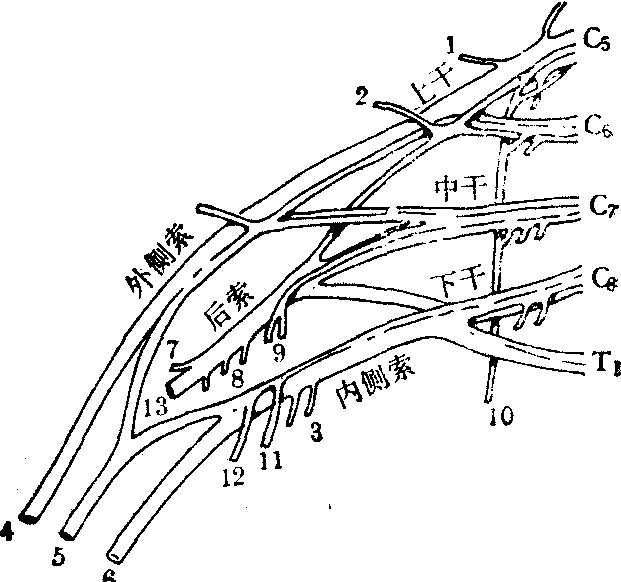 释义 | 臂丛神经损伤 臂丛神经损伤臂丛由颈5~8与胸1五根脊神经的前支组成,后者称臂丛神经根。颈5与颈6二根神经根共同组成臂丛的上干;颈7单独组成中干;颈8与胸1共同组成下干。这三干又各分为前支与后支。上、中两干的前支共同组成外侧索;上、中、下三干的后支共同组成后侧索;下干的前支单独组成内侧索。最后,由三索分出布于上肢的神经,主要是桡神经、正中神经和尺神经,支配整个上肢肌肉的活动和皮肤的感觉。 臂丛神经 1. 肩胛背神经 2. 肩胛上神经 3. 胸前神经 4.肌皮神经 5. 正中神经 6. 尺神经 7. 腋神经 8. 胸背神经 9. 肩胛下神经 10. 胸长神经 11. 臂内侧皮神经 12. 前臂内侧皮神经 13.桡神经臂丛损伤的临床表现 (1)上臂丛神经根 (颈5~7)损伤:主要表现是肩关节不能外展旋转与上举,肘关节不能屈而能伸,但肌力很弱,腕关节虽能屈伸但无力。上肢伸面感觉大部缺失,可能出现翼状肩胛现象。检查时,可发现肩部和上臂肌肉萎缩,特别是三角肌、肱二头肌更为显著。另外,前臂旋转亦有障碍,手指活动尚属正常。 (2)下臂丛神经根(颈 ![]() (3)臂丛上干损伤: 主要表现是肩关节不能外展与上举,肘关节不能屈而能伸,腕关节与手指活动如常。检查时可发现肩部肌肉萎缩,以三角肌最显著; 上臂肌肉萎缩,以肱二头肌最显著。常有上臂内旋、内收、前臂旋前、腕部屈曲、掌心向后的畸形。感觉缺失范围较小,主要限于肩外侧与前臂桡侧缘的皮肤。 (4)臂丛中干损伤: 很少见,由于它的神经纤维仅参与上肢伸面肌肉的部分支配,故伤后主要表现是肘关节、腕关节和掌指关节能伸直但无力。拇指伸直也无力,前臂背面和手背桡侧感觉障碍。 (5)臂丛下干损伤:手的功能发生严重障碍或丧失,腕关节虽能屈伸而力弱。肩、肘关节活动尚正常。因肱三头肌部分瘫痪而伸肘力量不足。无Horner综合征。检查时可见前臂屈面肌肉与手内在肌萎缩,有扁平手与爪形手畸形。感觉障碍主要限于上肢内侧及手部尺侧。当下干完全伤断时,拇指与手指不能屈曲,掌指关节能伸直外,指间关节不能伸直;拇指位于手的桡侧,不能做外展动作,从而使手的功能全部丧失。当下干部分损伤时,手的运动出现不同程度的障碍。 (6) 臂丛外侧索损伤: 由于肌皮神经、正中神经的上部受损,导致肱二头肌、旋前圆肌和桡侧腕屈肌麻痹,因此肘屈、前臂旋前和屈腕的力量受到影响,但由于有肱桡肌、旋前方肌和其他腕、指屈肌的分别代偿,而尚能保持上述三种功能,上肢的其他关节活动尚属正常。检查时可发现上臂屈面肌肉显著萎缩,胸大肌与前臂屈面肌肉亦有萎缩,前臂桡侧缘感觉缺失或减退。肘关节由于肱桡肌的代偿作用虽能够屈曲,但前臂多数需处于旋前位时才能做到,同时,肱二头肌扪不到收缩,腕关节屈时桡侧腕屈肌亦扪不到收缩。肩关节与手部诸关节的运动尚属正常。 (7)臂丛神经内侧索损伤: 主要表现是手指不能屈伸(掌指关节能伸直),拇指不能外展、对掌和对指。感觉缺失主要限于上肢内侧及手部尺侧。检查时可发现手内在肌与前臂屈肌明显萎缩呈扁平手和爪形手畸形。肩、肘关节功能正常,无Horner综合征。 (8)臂丛神经后索损伤: 主要表现是肩关节不能外展,上臂不能内旋,肘与腕关节不能背伸,掌指关节不能伸直,拇指不能伸直,肩外侧、前臂背面和手背桡侧半的感觉障碍或丧失。检查时可发现三角肌、三头肌背阔肌与前臂伸肌群萎缩,并无收缩功能。其它关节活动正常。 (9)全臂丛损伤: 较多见,在早期,整个上肢麻痹,各关节不能主动运动,但被动活动范围正常。由于斜方肌功能存在,仍有耸肩运动。上肢感觉除臂内侧尚有部分区域保持外,其余全部丧失。上肢腱反射全部消失,温度略低,肢体远端肿胀。 在晚期,上肢肌肉显著萎缩,各关节常因关节囊挛缩而致被动活动受限,特别是肩关节与指关节更严重。Hor-ner综合征可能存在。 臂丛损伤诊断要点 损伤多是部分性的,但伤后常呈现全臂丛麻痹,约在2~3周后逐渐恢复部分功能,这时才能确诊真实的损伤程度。凡有下述之一者,即应考虑为臂丛损伤,并可根据上述情况判断损伤部位。 ❶有桡神经、正中神经和尺神经同时受损伤的征象,并有上肢被牵拉或颈部、肩胸部受伤史者。 ❷有上述神经之一损伤的症状,并有肩肘关节运动障碍者。 ❸有尺神经损伤的症状和上肢内侧皮肤感觉障碍,受伤部位在颈部或肩胸部者。 ❹肩、肘、腕关节功能虽好,但手指活动丧失,手部或上肢的部分皮肤有感觉障碍,且有颈肩部受伤史者。 ❺肩、肘关节运动障碍,部分上肢皮肤感觉消失,且有颈肩部受伤史者。 ❻少数病人伴有灼性神经痛或血管损伤。 ❼上肢和肩部肌肉有萎缩。 臂丛损伤治疗原则 一般原则是臂丛损伤并伴有危及生命的严重损伤时,神经暂不处理。一般来说,手术越早效果越好。根据情况,伤后可立即手术或延期手术。 ❶急诊手术: 如修复伤口,探查血管或骨折切开复位时,应同时修复伤断的神经。 ❷早期手术:伤后一月内手术者。如主要神经已断,或其功能全部丧失,或其主要功能丧失者。 ❸中期手术: 伤后一年内手术者。如主要神经功能丧失不十分严重或有自行恢复依据者。 ❹晚期手术: 受伤一年后手术者。神经伤后肢体主要功能未恢复,而肌肉萎缩不严重者。 ❺后期手术:受伤神经功能不能恢复时,可考虑采用肌腱或骨关节手术,使恢复肢体的一部分