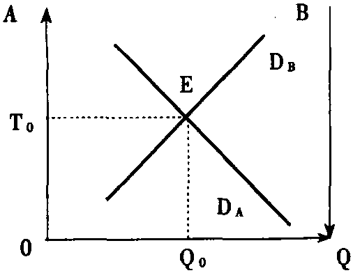 自愿交换模型Voluntary Exchange Model由瑞典经济学家K.魏克赛尔提出,又由瑞典经济学家E.林达尔加以发展的、论述公共物品是否可以根据一致的协议没有强制地提供的理论。林达尔认为,赋税的份额和公共物品的数量开始时都不是确定的。达到一致协议的条件是各人所交纳的税收份额恰好等于各人从公共物品中所获得的边际效用。可用下图来说明这一条件。下图假设的是一个有两个人的社会。纵轴是A、B两人所承担的税收份额。OA表示从下向上,A所承担的税收份额增加,QB表示从上向下,B所承担的税收份额增加。DA是A对公共物品的需求曲线,表明随着A承担的税收份额的减少,他对公共物品的需求增加;DB是B对公共物品的需求曲线,表明随着B承担的税收份额的减少,他对公共物品的需求增加。当DA与DB相交于E时,决定了A与B各自承担的税收份额为T0,公共物品的供给量为Q0。这时对A与B而言,他们所愿承担的税收份额与他们从公共物品中获得的边际效用相等。在这个条件下,就可以通过一致的协议,而不必通过强制来为公共物品筹资,有一个均衡的公共物品供应量。在这个模型下,每个人在承担一定税收份额时消费他的“最优的”公共物品量,从而使社会公共物品的供给量达到帕累托最优。但许多现代经济学家认为,事实上难于达成一致的协议,而且由于公共物品的非排他性,不承担一定税收份额的人也可以从公共物品中获得效用(即存在“搭便车”现象),公共物品仍然是通过强制征税的方法来筹资的。