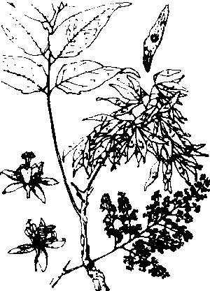 | 释义 | 臭椿tree of heaven; ailanthus中国黄河中下游夏季蜜源植物。学名Ailanthus altissima (Mill.)Swingle。别名椿树。苦木科。落叶乔木,高达20米,单数羽状复叶互生,小叶13~25,叶片卵状披针形或狭卵形,圆锥花序顶生,花杂性,浅黄绿色或绿白色。蜜腺位于雄蕊基部。翅果矩圆状椭圆形。(见图)