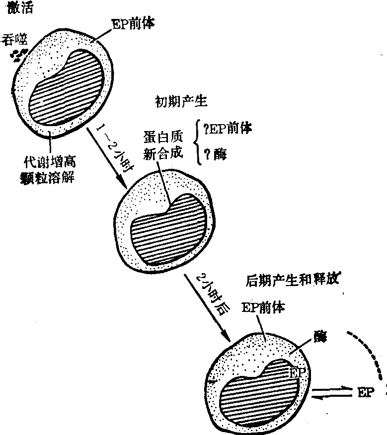 能产生和释放EP的细胞,统称为产致热原细胞。长期以来认为中性粒细胞及单核细胞都能产生EP。新近的资料进一步肯定单核细胞的这一功能,而中性粒细胞则有疑问。单核细胞即巨噬细胞,包括血单核细胞和组织单核细胞 (如肺泡巨噬细胞、脾窦巨噬细胞和肝星状细胞)。近年来有些学者还发现某些肿瘤细胞也能产生和释放致热原,其性质与EP相似。 产致热原细胞平时只含微量EP,且不自动释出,只是被激活时才释出。能激活人体产致热原细胞产生和释放EP的激活物有病毒、细菌、真菌、细菌产物、内毒素、原胆烷醇酮、抗原-抗体复合物、炎性渗出液中的大分子物质、多核苷酸和淋巴因子等。从激活物与产致热原细胞相作用,到大量释放致热原的基本程序,根据人类白细胞吞噬死葡萄球菌的观察结果可分为: ❶激活,即产致热原细胞与激活物(死葡萄球菌)相作用的过程,激活所需时间与吞噬的时间相一致(15~20分钟)。此时细胞发生一系列代谢变化,包括耗氧量增多、糖原分解和葡萄糖氧化加强,溶酶体膜破裂,水解酶释入吞噬囊泡和培养基中。 ❷吞噬细菌后1~2小时,细胞内可能形成“致热原前体分子”或形成使前体分子转化为活化型所需的酶。此阶段需要有新合成的信使核糖核酸和蛋白质的参与,若加入其合成抑制物,能阻碍致热原的产生和释放。在这个阶段内,细胞内或培养基内仍未发现EP (图2)。 ❸激活(吞噬死菌)后2小时,细胞内和培养基中可发现足量的致热原,此时如再加入蛋白质合成抑制物,则不能阻止致热原的产生和释放。到激活后的2~6小时,培养基中致热原迅速增多,而细胞内含量则很低,到6小时后,培养基中EP增多较慢,细胞内含量则增多。这种情况一直持续到激活后18小时(即观察结束时)。 图2 内生致热原的产生和释放 ☚ 发热 感染 ☛ |