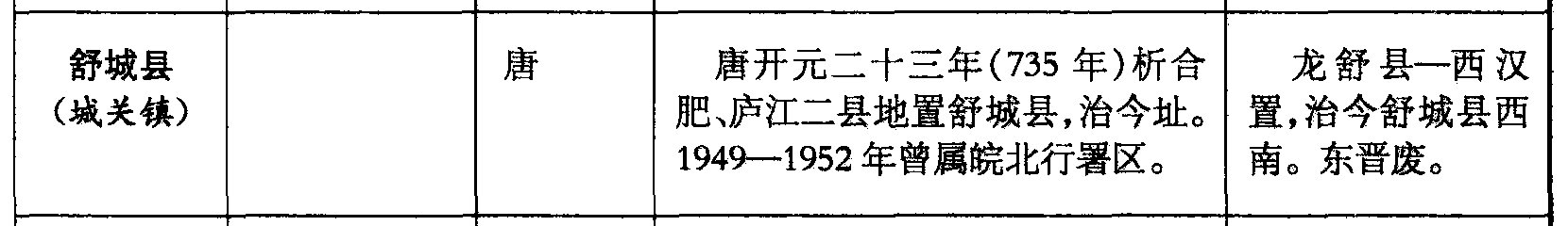 舒城县(城关镇)唐唐开元二十三年(735年)析合肥、庐江二县地置舒城县,治今址。1949—1952年曾属皖北行署区。龙舒县—西汉置,治今舒城县西南。东晋废。