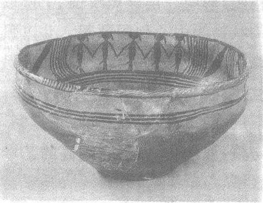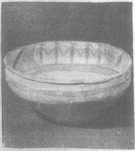 新石器时代马家窑文化马家窑类型。高14.1厘米,口径29厘米。1973年青海省大通县上孙家寨出土。北京中国历史博物馆藏。此器仅在器腹饰简单的圈带纹三周。其动人之处是在盆内壁所绘的舞蹈纹。舞蹈形象使用剪影式平涂,分3组起舞,每组5人。人物身体左向,腿微微分开,手拉手,步调一致,翩翩起舞,发辫和尾饰摆动有节。观其姿态,有如今日的藏、傣等少数民族的一种基本舞姿。尽管描绘极为简略,但体现了我们祖先在劳作间隙时的文娱活动,其欢乐和谐的场面显示出劳动者的朴实、开朗和精神领域的充实,具有极强的感染力。马家窑文化出土的众多彩陶中,画有舞蹈纹的仅此一件,其珍贵可想而知。近年已出现仿制此种纹饰的彩陶器,足见今人对此古代艺术的珍爱。马家窑文化见“束腰彩陶罐”条目。