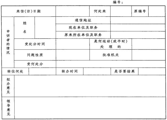 释义 | 党纪处分申诉登记卡 【简介】: 是纪检机关信访部门对受处分党员申诉书进行登记处理而使用的登记卡。在纪检机关的信访工作中,常常遇到一些受过处分的同志对所受处分不服,向党的纪检机关提出申诉,其中有的属于以往历次运动中遗留下来的问题,有的属于冤假错案,有的是违纪者对自己所犯错误尚未完全认识等,通过填写《党纪处分申诉登记卡》,有利于从纷繁的材料中整理出问题,明确问题所在,也有利于对申诉材料加以归类整理,建档查阅。 【范例】: 党纪处分申诉登记卡 |