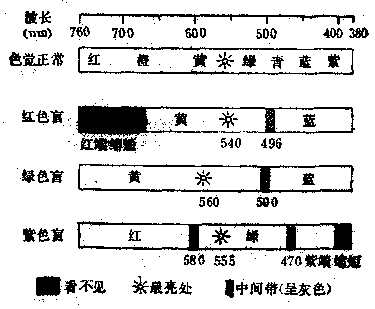释义 | 色盲sèmáng眼睛不能辨别颜色的先天性疾病。 色盲sèmáng〈名〉眼睛不能辨别颜色的视觉障碍:半色盲│全色盲│红绿色盲。 色盲sè máng眼睛不能辨别颜色的病。1898年严复译《天演论》卷下:“色盲不能辨色。” 五官症状 五官症状夜盲症:鸡盲 雀蒙(雀蒙眼) 雀盲(雀盲眼) ☚ 头部症状 消化症状 ☛ 色盲monochromattism无辨色力称为色盲。正常人能辨别出红、橙、黄、绿、青、蓝、紫等各种颜色。但有些人只能查知“白色”,而不能辨认其他各种颜色,称为完全色盲;仅不能辨认红绿者,称为红绿色盲;有的能辨认颜色,但费时费力,为辨色力弱。色盲多为先天性者。患色盲者常不能担任某些需观察颜色的工作。 色盲 色盲Semang一个颜色视觉正常的人,能够分辨各种颜色。有的人对某些颜色的辨别能力差,这种人称为色弱,有人出生后就不能辨别某些颜色或全部颜色,这种人是先天性色盲。还有人因视觉系统的疾病而不能辨别颜色,这种人为后天性色盲。色盲又可分为局部色盲和完全色盲,局部色盲大部分为红、绿色盲,黄、蓝色盲较少。全色盲的人视网膜缺少锥体细胞,或者锥体细胞功能丧失,而主要靠杆体细胞视物,因而看可见光谱只是一条不同明暗的灰带。 ☚ 色的视觉现象 光色 ☛ 色盲colour blindness指失去辨别颜色能力的色觉障碍。以先天性者多见。为锥细胞缺少某一种(红或绿或蓝)感光色素所致。可分为全色盲及部分色盲。前者极少见,后者较常见,表现为红绿色盲或蓝色盲。多与遗传有关。某些工作必须具备正常的辨色力,因此,色觉检查已成为服兵役、就业、入学前体格检查中的常规项目。 色盲 色盲色盲与色弱是辨色功能障碍的一种视觉缺陷。色觉主要是锥体细胞的功能,由于视网膜中心部锥体细胞最为集中,故此处辨色功能最好;愈向周边部,视网膜对绿、红、黄、蓝各种色觉的感受力依次消失。色光的色调决定于波长,人眼可见光线的波长范围为390~780nm(紫~红)。色光的亮度感不一,在明亮处以波长555nm的黄绿部分为最高,而在黑暗处则以波长510nm的青绿部分为最明显。纯色光中如混入白光,则可使饱和度(纯度)减低。色光可以混合而得到中间色调,例如,红光绿光相混合,按其比例不同可得到橙、黄、黄绿等色;而绿紫光相混合可得到青蓝等色; 红紫光相混合则得到光谱中所没有的紫红色。若将红、绿、紫三色作适当的混合,可得白色。两种色光在混合后如能得到白色光,则此两色互称为补色,例如,红光与绿光、黄光与蓝光、黄绿光与紫光,这三对都彼此互补。而在颜料上的补色,则以两种不同颜料相混后变为黑色者始称为补色。关于分辨颜色的机理,目前尚在继续研究。 明亮度曲线 ——正常亮适应眼 ………正常暗适应眼 补色示意图 三条实线表示三种色盲 虚线表示红绿色盲 Young-Helmholtz三色说 (2) Hering对色学说:则认为红与绿、黄与蓝、白与黑构成了三对色,对所有颜色的感觉都是根据这三对色光的互相转化程度而定。 (3) Ladd—Fran-klin进化说:认为色觉是随着生物的进化而形成的,低等动物无色觉,只能辨别辨别亮与暗;随着动物进化逐渐能区别长波(黄光)与短波(蓝光); 以后再从黄光感觉中分化出对红与绿光的感觉。 ![]() Hering 对色说 ![]() Ladd-Franklin进化说 从电生理的实验结果来看,目前认为三色说可以用来说明视细胞水平上的颜色感受机理;而对色学说可以用来解释视细胞以后各级神经元进行色信息处理的过程(如后象现象、对比等)。 色盲绝大多数是先天性色觉缺陷。全色盲又名单色视,极为少见。患者全无色感,只有明、暗和黑、白的感觉。常伴有羞明、眼球震颤和视力低下; 红色盲又名第一型色盲,对红色及其补色(青绿)都不能分辨;绿色盲又名第二型色盲,对绿色及其补色(红紫色)都不能分辨;黄蓝色盲又名第三型色盲,缺乏对黄蓝两色的感觉,整个光谱中只剩红绿两种原色可辨别。此种色盲极为少见。 色弱患者虽具有对三原色的分辨功能,但这一功能并不完全,可有强弱之分,与色盲的分型相似,分为红色弱、绿色弱 (或两者合称为红绿色弱) 以及极少见的黄蓝色弱。 色弱与色盲的界线不易严格划分。红色盲与绿色盲并不是前者认不出红色、而后者认不出绿色,实际上,失去对一种原色的辨别力,则对其相对立的补色也就无法分辨。红色盲不但看不出红色(光谱红端缩短),而且也失去青绿色(呈灰色即中性带),整个光谱只剩下黄蓝二色。绿色盲所见也仅黄蓝二色。唯无色部分一头落在青绿色中(500nm),另一头落在光谱红端之外,所以不出现红端缩短。由于红色盲与绿色盲性质接近,故常合称红绿色盲。 色盲者对彩色的色感觉 先天性辨色功能障碍的发病率,男性约为5%,女性约0.5%,以发生频度排列依次为:绿色弱、绿色盲、红色弱、红色盲、黄蓝色弱(盲)、全色盲。 辨色功能障碍的遗传型式为: 红绿色盲(色弱)属性连锁隐性遗传,男性患者(xY),通过色觉正常但带有致病基因的全部女儿(Xx)遗传给半数的外孙(xY)。如果女婿也是色盲(xY),则外孙和外孙女中都有半数会出现色盲(xY,xx)。致病基因存在于X染色体中(以小写x表示),故男性只要有一个致病基因就必然显示得病,而女性要有两个致病基因(xx)才显病,在女性都是隐性的(即Xx,不出现色盲)。因此患者多系男性。黄蓝色盲属常染色体显性遗传,全色盲则属常染色体隐性遗传。目前对先天性色觉缺陷尚无特