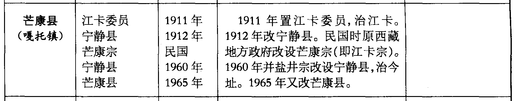 芒康县(嘎托镇)江卡委员宁静县芒康宗宁静县芒康县1911年1912年民国1960年1965年1911年置江卡委员,治江卡。1912年改宁静县。民国时原西藏地方政府改设芒康宗(即江卡宗)。1960年并盐井宗改设宁静县,治今址。1965年又改芒康县。