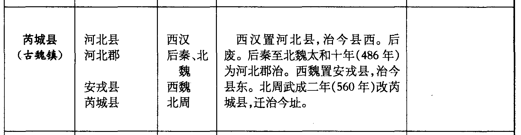 芮城县(古魏镇)河北县河北郡安戎县芮城县西汉后秦、北魏西魏北周西汉置河北县,治今县西。后废。后秦至北魏太和十年(486年)为河北郡治。西魏置安戎县,治今县东。北周武成二年(560年)改芮城县,迁治今址。