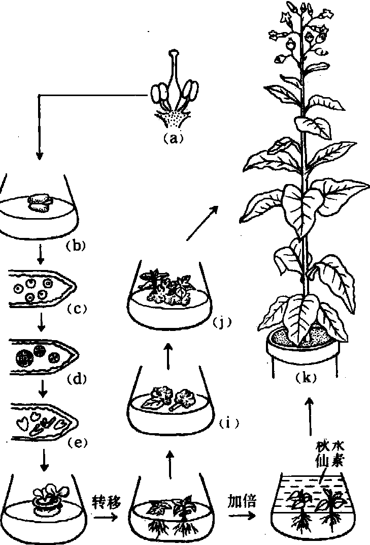 花药培养图解 (a)除去雄蕊和雌蕊; (b)接种的花药; (c)、(d)、(e)花粉发育为胚状体; (f)单倍体花粉植株;(g)转移培养;(h)秋水仙素浸泡; (i)、(j)愈伤组织培养; (k)纯合二倍体植株