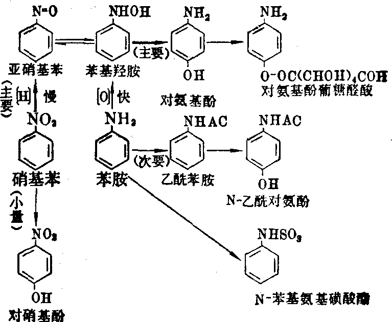 苯胺和硝基苯在体内转化示意图 用兔实验见到苯胺在体内的转化物,主要为对氨基酚和邻氨基酚,其吸收量的28%与硫酸结合而为N-苯基氨基磺酸酯,10~15%与葡糖醛酸结合,而为对氨基酚葡糖醛酸,还可有N-乙酰对氨基酚结合物,均经肾脏排出。人接触苯胺,在开始接触后的6~8小时,排泄量与吸收量可达到固定的比例。由于代谢产物不能在体内蓄积,故一个工作日下班后尿内代谢产物排泄量,常能反映当天的吸收程度。正常人尿内有微量的氨基酚,平均为3.7mg/1,当服用一些苯胺为原料的合成药后,尿中对氨基酚量可增加。 硝基苯的代谢,主要先经还原后而进一步转化,主要转化物有对氨基酚,仅有小量间硝基酚和对硝基酚; 邻位和间位氨基酚,在人体内的代谢比大鼠的慢。 在苯胺和硝基苯的转化过程中,还经历一些中间体如亚硝基苯和苯基羟胺,它们仅在血液中短暂地存在,但在毒作用中却是重要因素。 对本类化合物中毒的预防、应同时注意呼吸道吸入和皮肤污染,有时应以预防经皮中毒为重点。 不少品种吸收后,可以从尿中检出其代谢产物,作为接触其母体物的指标,如接触苯胺、硝基苯者可测尿中的对氨基酚。尿中对氨基酚量还可作为生物最高容许浓度的指标。 苯 胺 衍 生 物