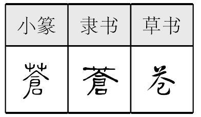 【提示】艹,3画,宋体是一横两竖,楷体第三笔是撇;旧字形4画,中间一横断为两笔。 仓, 下面是 ,不要错写成巳或匕、 。 *苍(蒼)cāng7画 艹部 (1) 青黑色(深蓝或深绿色): ~翠|~郁。 (2) 借指天: ~天|上~。 (3) 灰白色(多指头发斑白): ~髯|白发(fà)~~。 苍蒼cāng战国形声字。从艹(艸),仓(倉)声。本指草色,有深绿色之义。如:苍松。引申为青色。如:苍天。又转义为灰白。如:面色苍白|两鬓苍苍|苍老。 苍蒼★繁◎常★常