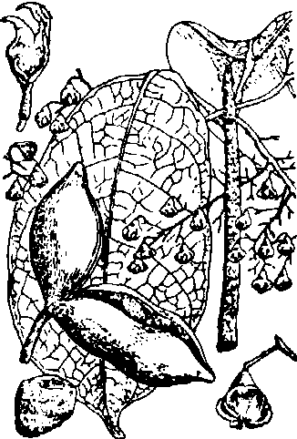 苹婆common sterculiaSterculia nobilis,别名凤眼果、富贵子。梧桐科苹婆属常绿乔木。树干通直,高达20m,树皮褐色。单叶互生,倒卵状椭圆形;腋生圆锥花序、下垂, 花杂性,无花瓣,花萼微带红晕,花期4~5月,8~9月可二次开花。蓇葖果卵形,9~10月成熟时红色。产中国贵州、云南、海南、广东、广西、福建、台湾等地, 印度、越南、印度尼西亚也有分布。喜光,喜温暖湿润气候,在肥沃排水良好的酸性、中性或钙质土壤均可生长,也较耐瘠薄。根系发达,速生。用播种或扦插法繁殖,实生苗4~5年生始花。 苹婆树冠整齐、树姿优美,多用做庭荫树或行道树。