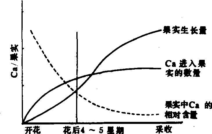 缺钾的苹果树新梢细弱,顶芽不发育或枯尖,叶片焦枯或卷曲,易破碎,果实小又多畸形,品质低劣。 钙(Ca) 苹果树体中的钙主要是果胶酸钙,是细胞壁的结构成分。果实含钙量比叶片低,是邻近叶片的1/40~1/10。果实中含钙低是许多果实贮藏病害的起因之一,如苹果苦痘病、红玉斑点病、水心病等。北方石灰性土壤中钙本是丰富的,但干旱,铵态氮的存在,钾离子浓度较高等条件下,会减少根系对钙的吸收;矿质元素硼、锌、铜、锰和硝态氮能增加苹果根系对钙的吸收和利用。果实含钙量,大约在盛花后4~5个星期有一个临界期,在此前果实吸收的钙不断增加,其后钙则很少进入果实;果实体积不断增大,使钙的相对含量大大下降(图3)。土壤中的硝态氮能促使钙向果实运输,改善果实钙的营养状况。土壤中镁离子浓度较高时有利于缓解果实缺钙症状。苹果树缺钙时,在根系上反映很快,而且明显,新根停止生长早,根短而多分叉;地上部的缺钙表现在幼叶卷曲并失绿,叶尖出现钩状,叶边缘皱缩,叶片易破碎。缺钙果实的病害,一般在采后贮藏期发生,严重的在树上成熟前着色时就表现出来。